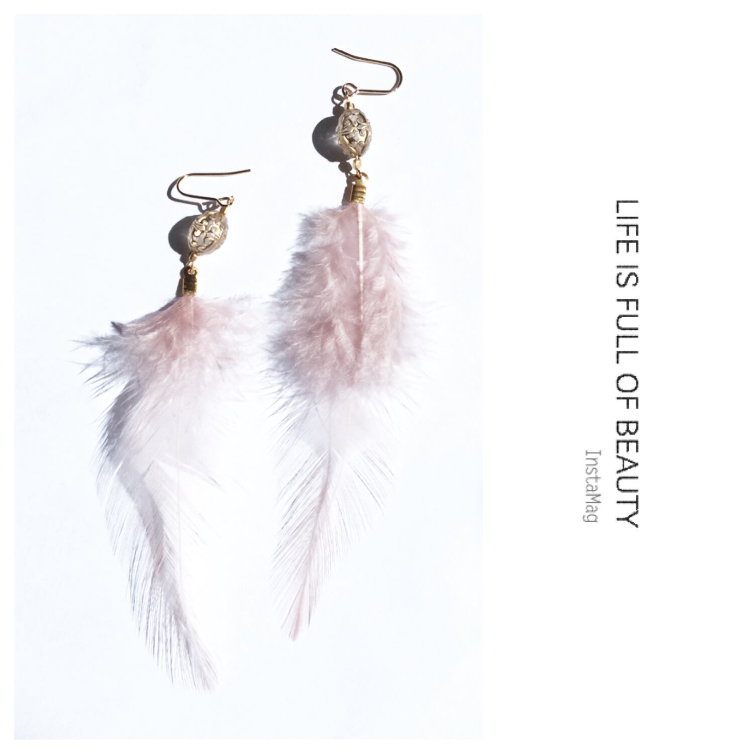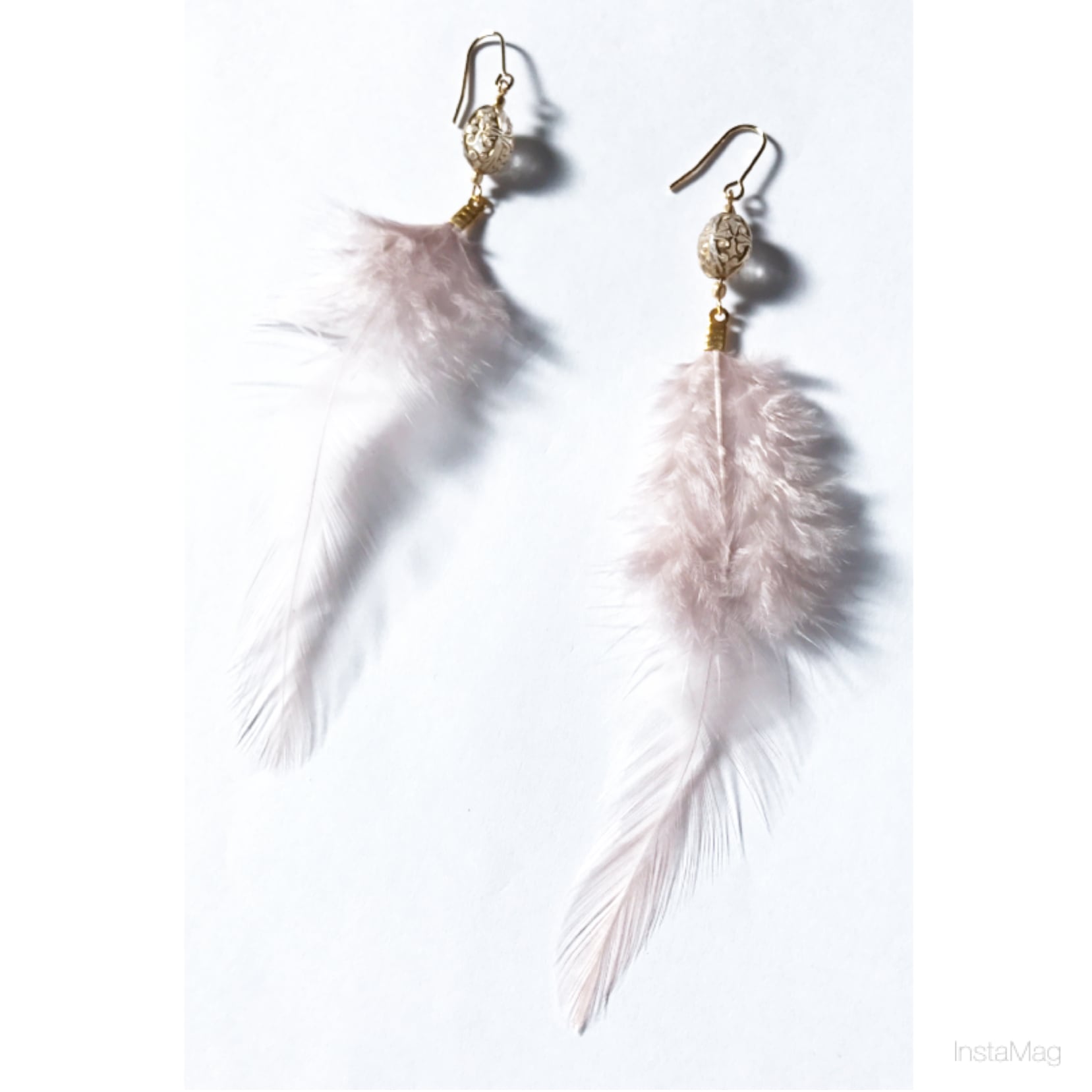 淡い優しいピンクの羽とオリエンタルな雰囲気のビーズを合わせてシンプルに仕上げたピアス、イヤリングです。
