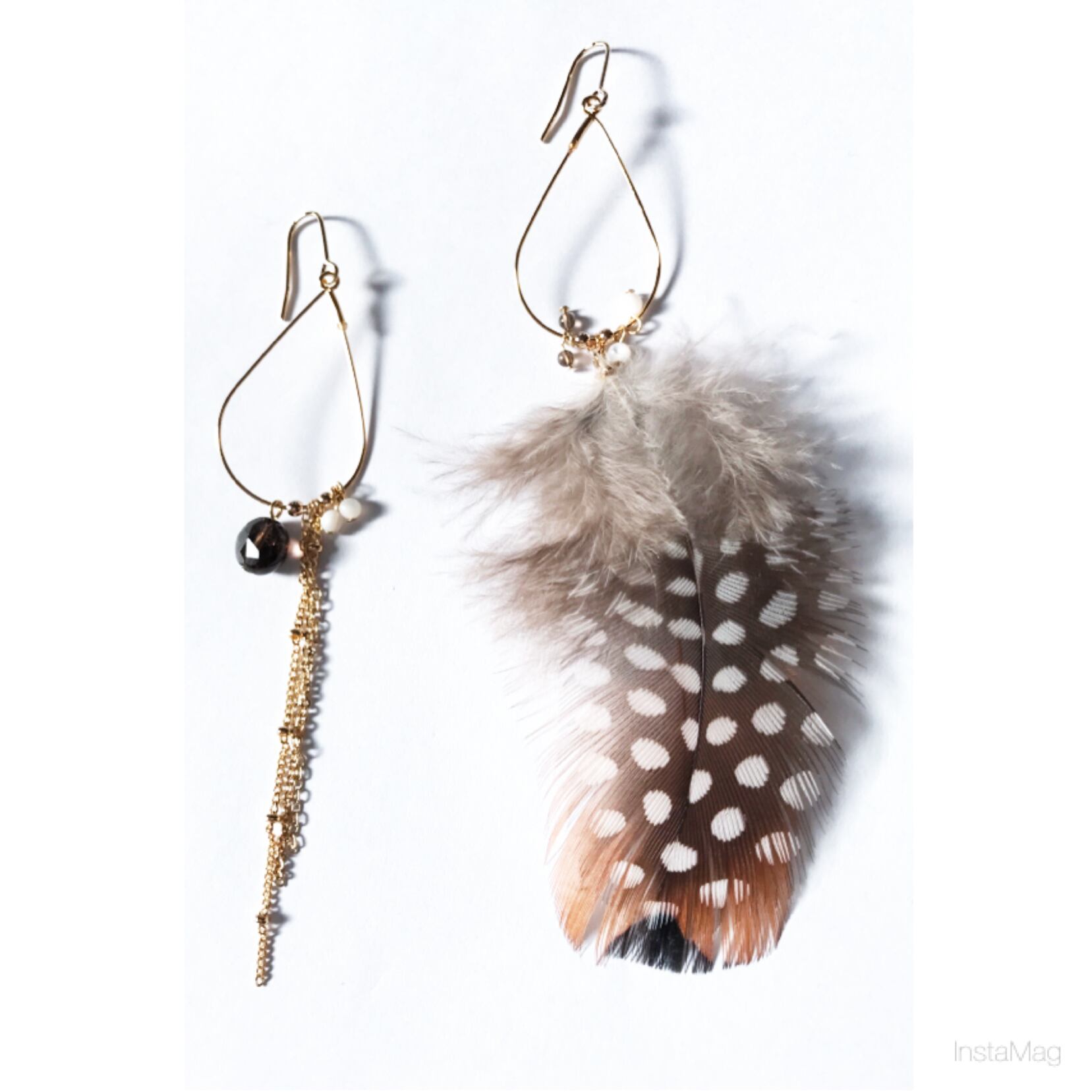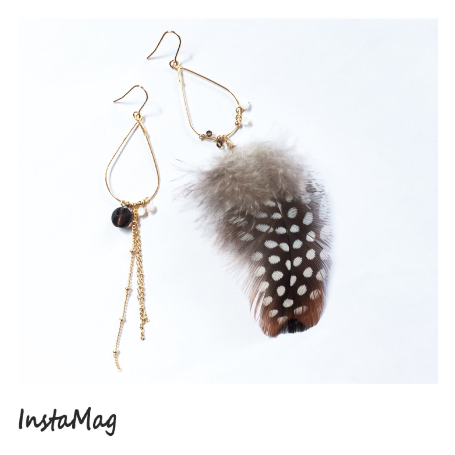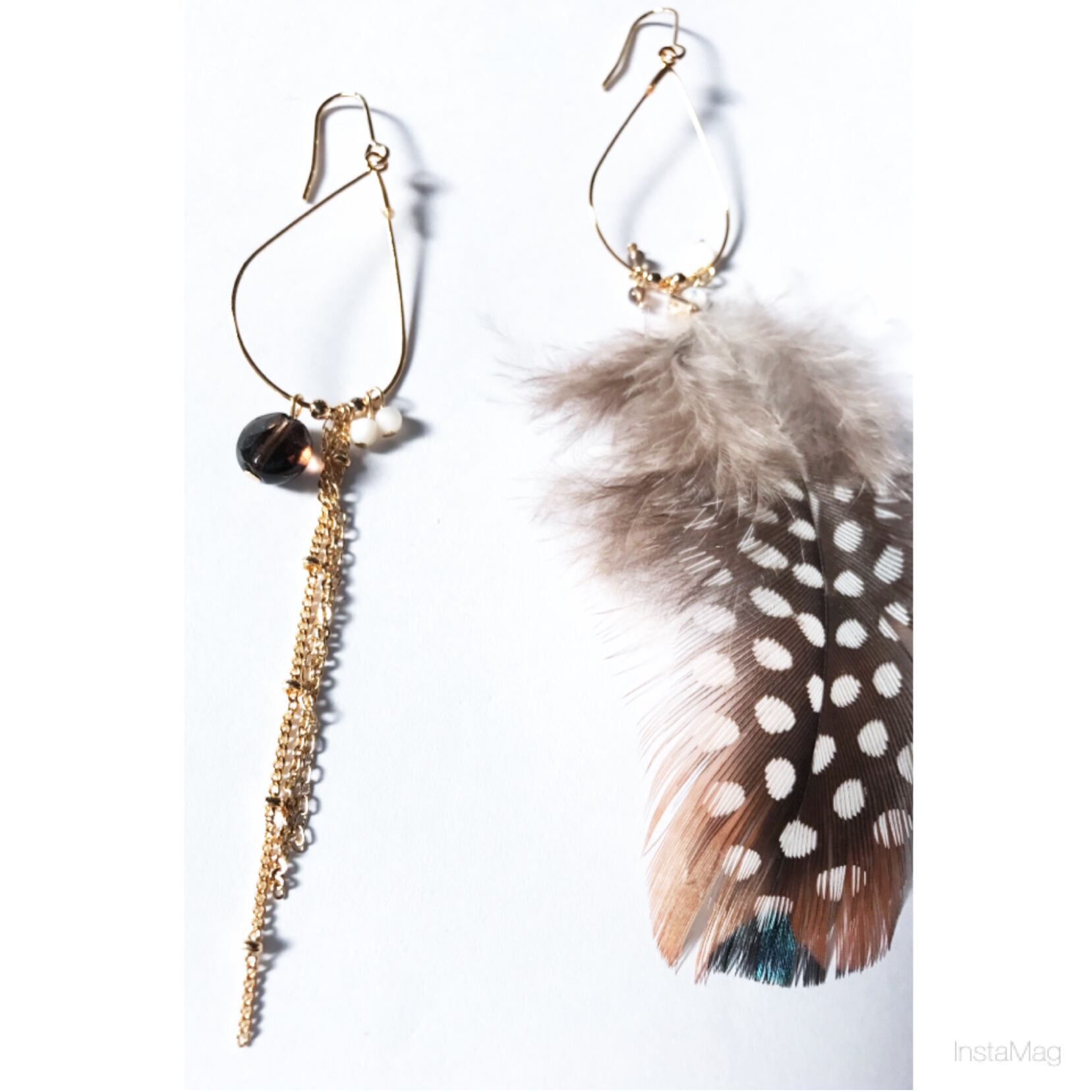 二種類の羽でボリュームを出し、天然石とチェーンを合わせた左右デザインの違うアシメントリーなピアス、イヤリングです!