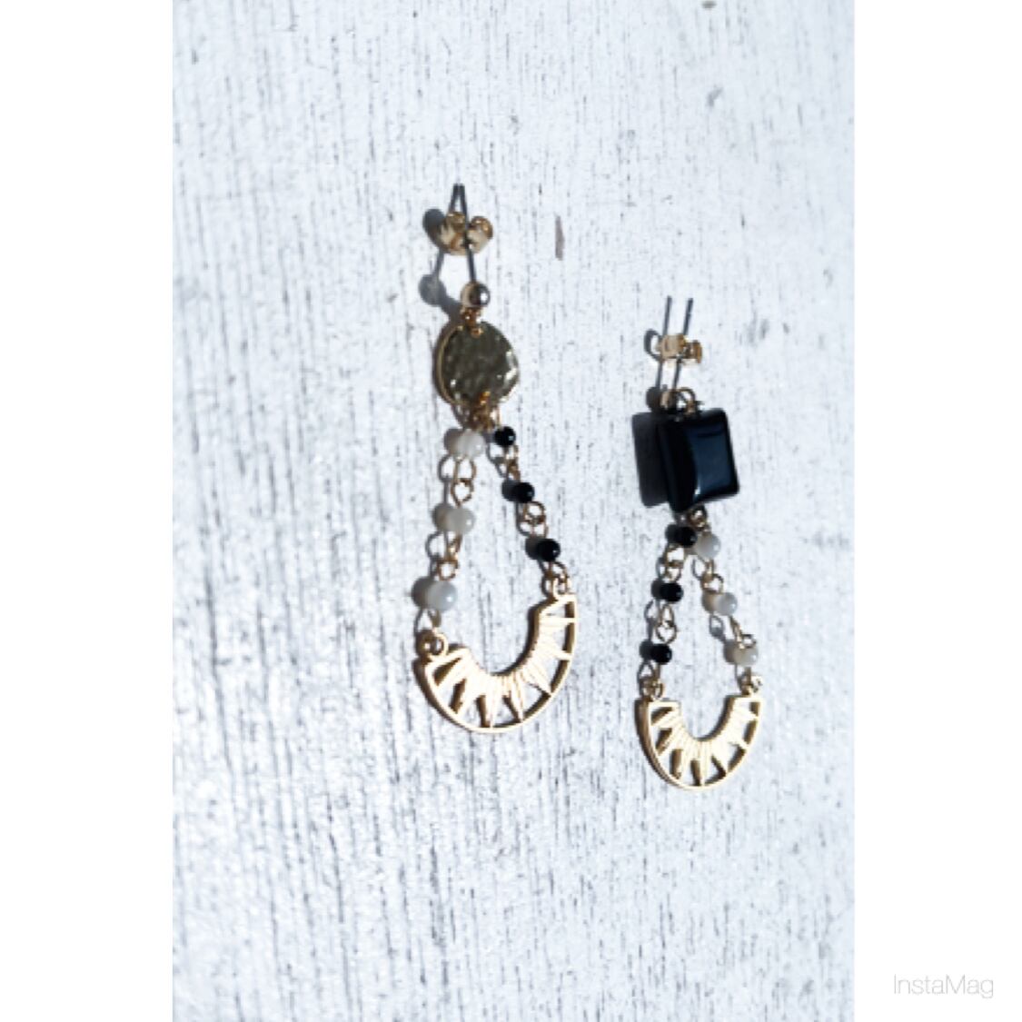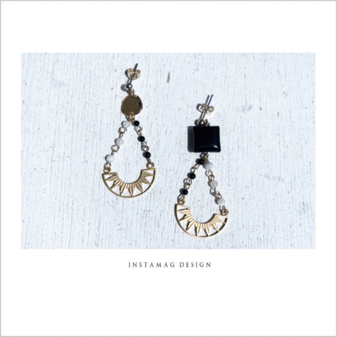 白と黒のモノトーンのボヘミアン調のピアス、イヤリングです。