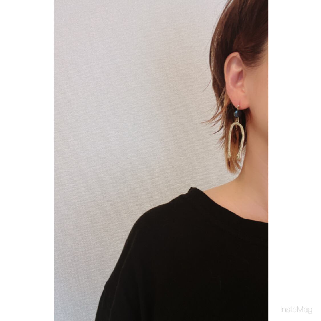 遊び心のあるハンドパーツをメインに、左右形の異なる黒のオニキスを合わせたピアス、イヤリング。
