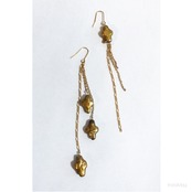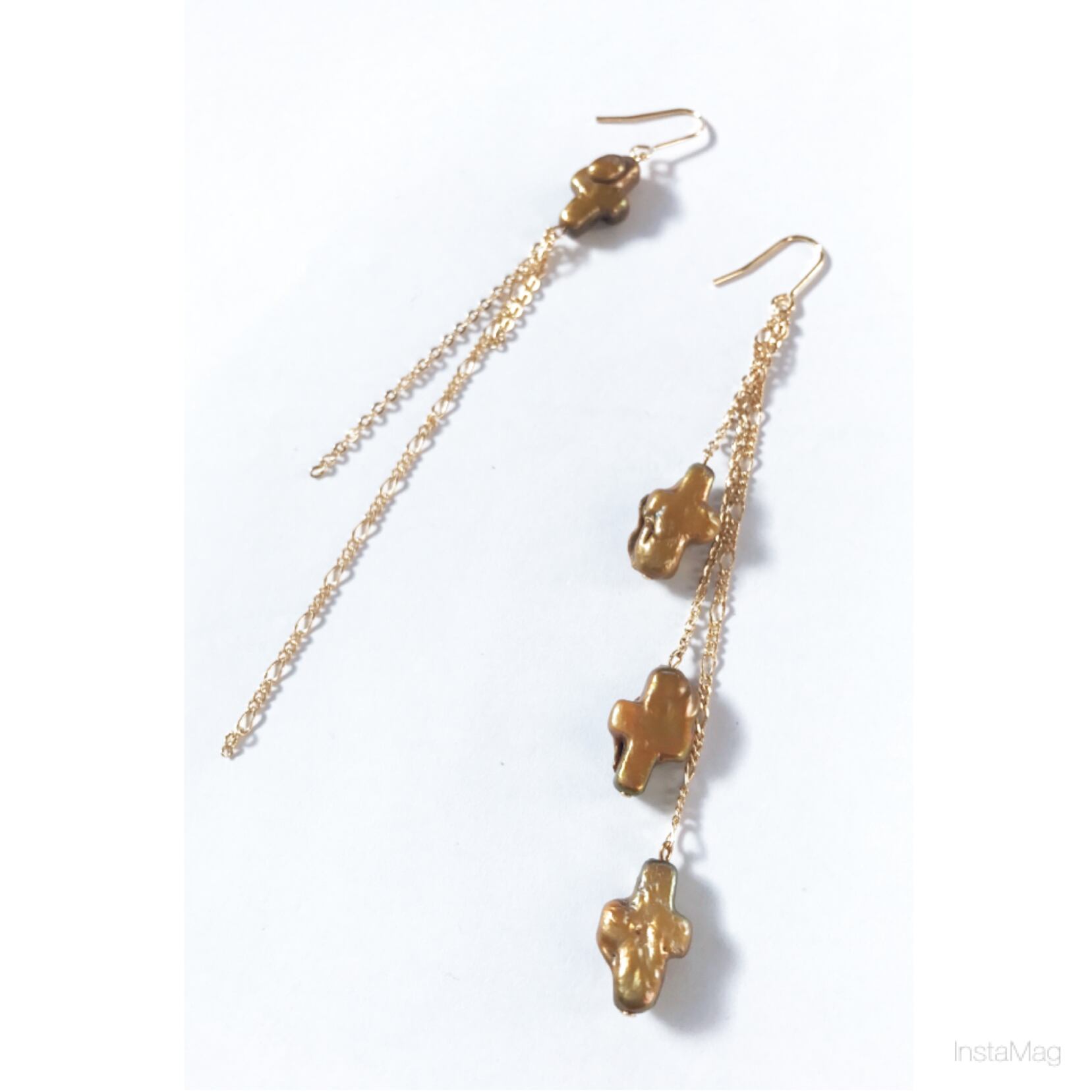 クロスの形の核を入れ、それに真珠層が巻かれている珍しい淡水真珠を使用した左右デザインの違うアシメントリータイプのピアス、イヤリングです。