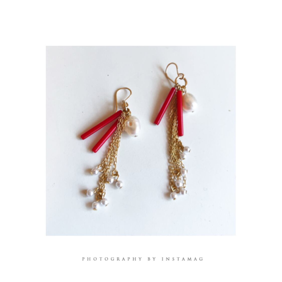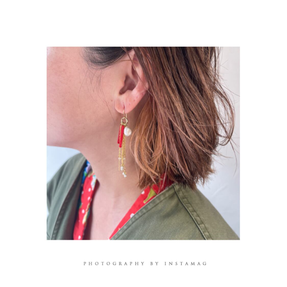 小さなパールを細いチェーンでジャラッとさせて左右長さの異なるアシメントリーデザインにしたピアス、イヤリングです。