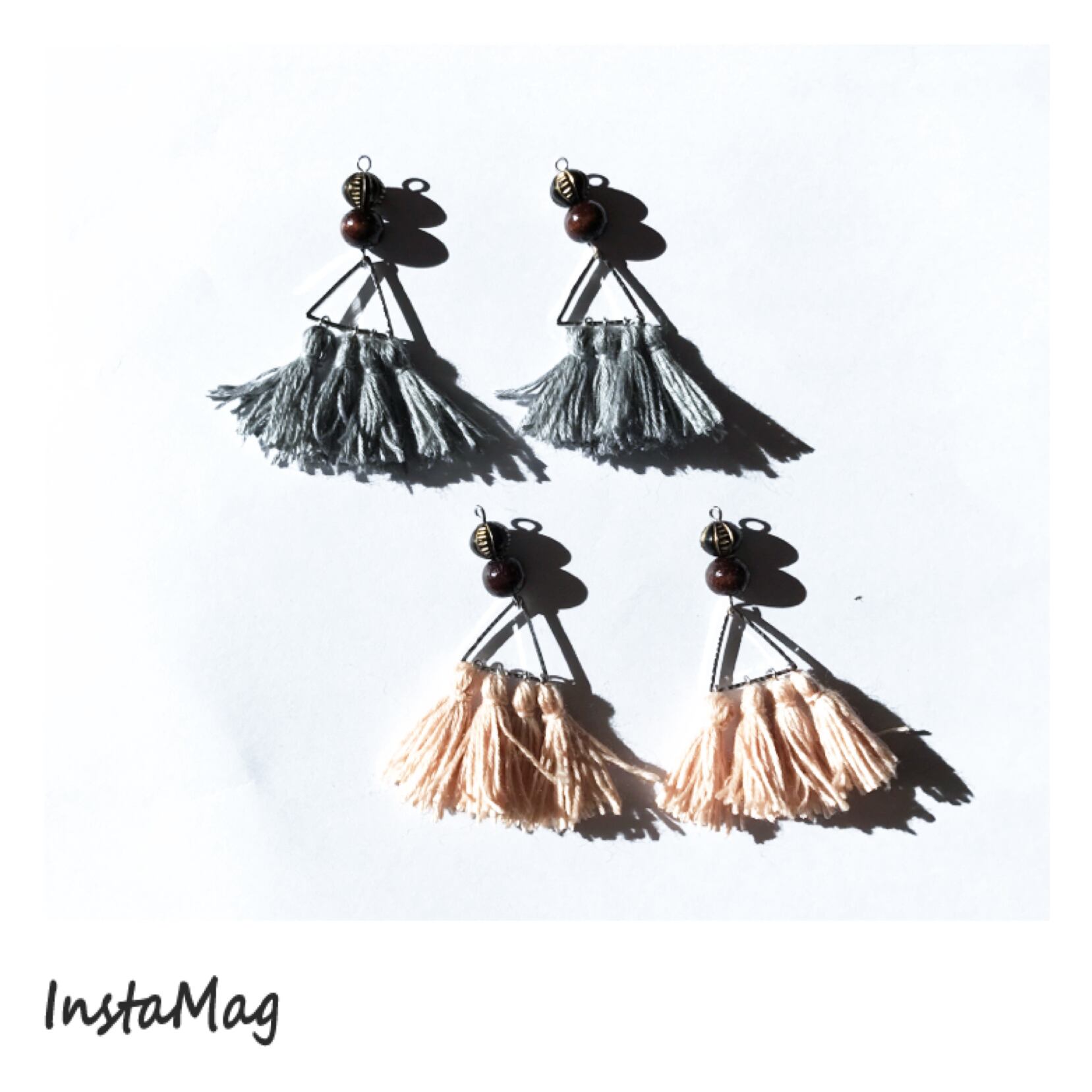 トライアングルパーツにタッセルを合わせた、オリエンタルな雰囲気のピアス、イヤリングです。