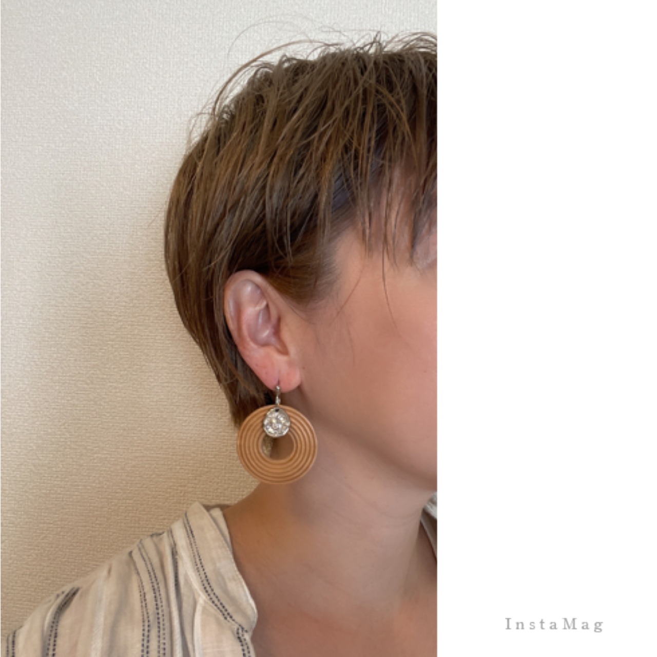 大振りなウッドサークルに太陽と鳥のモチーフのチャームを合わせたピアス、イヤリングです。