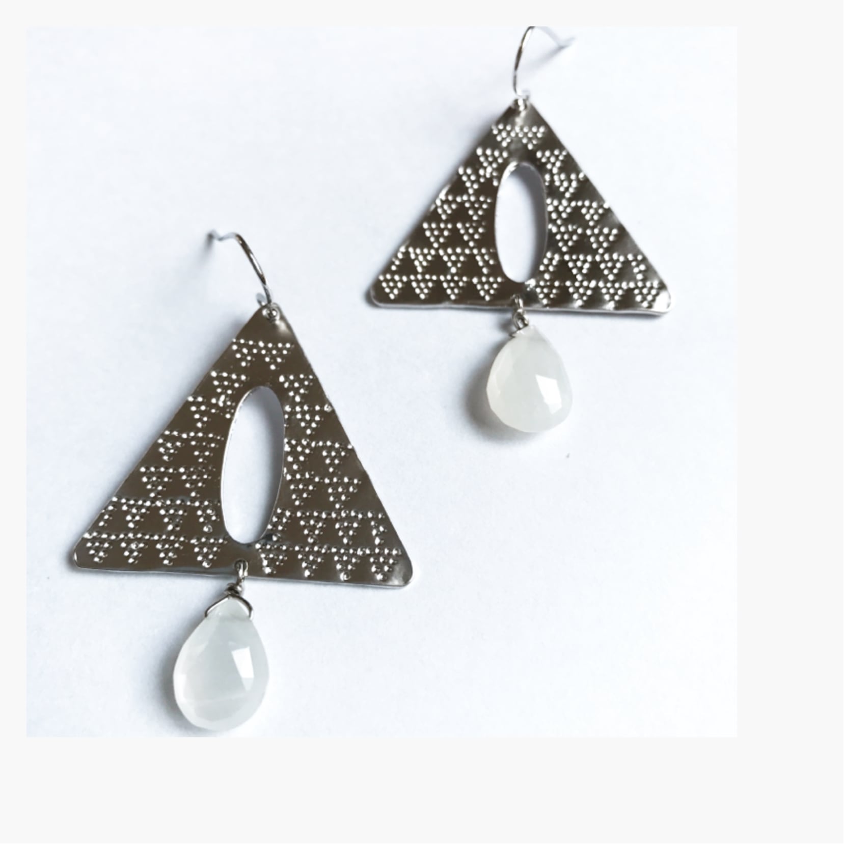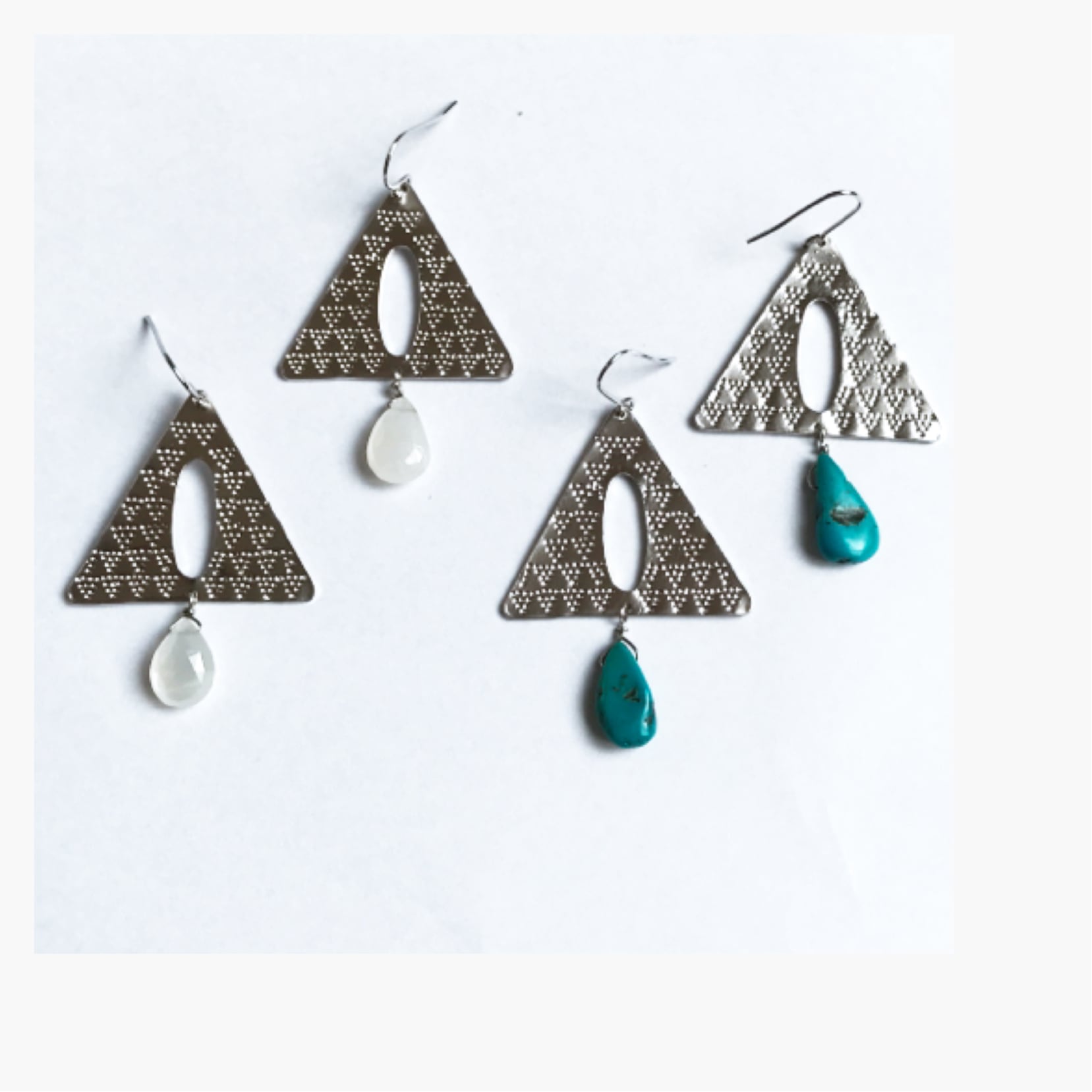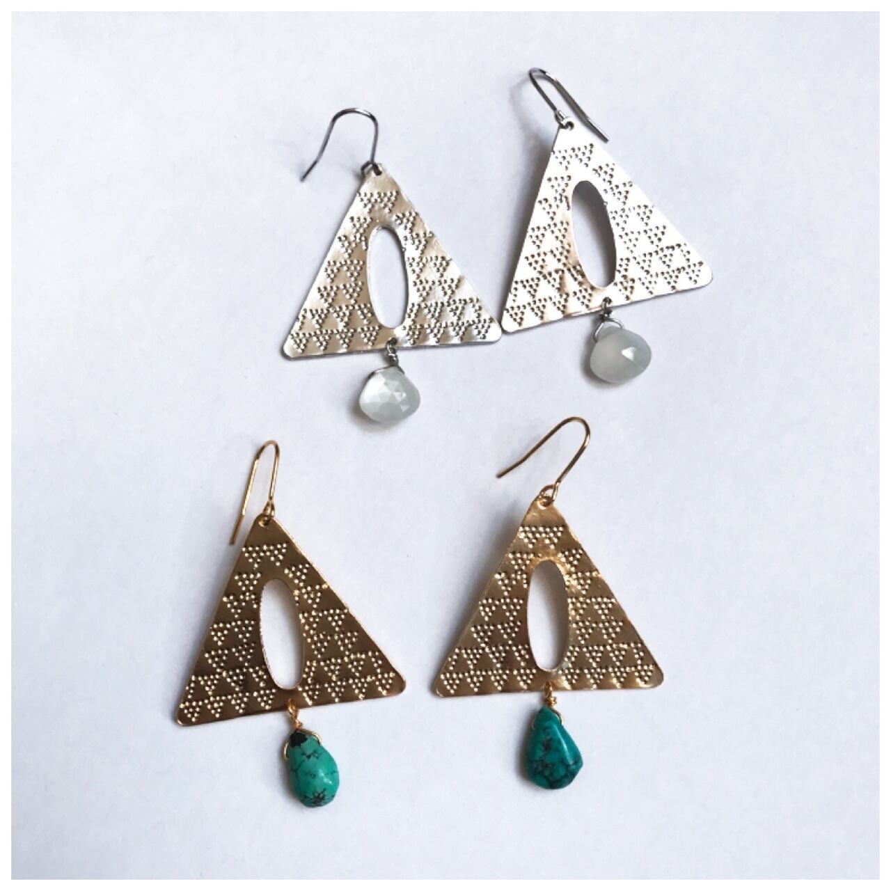 インポートものの、彫りの入った三角プレートにターコイズか、ムーンストーンの天然石のシンプルでインパクトのあるピアスです!