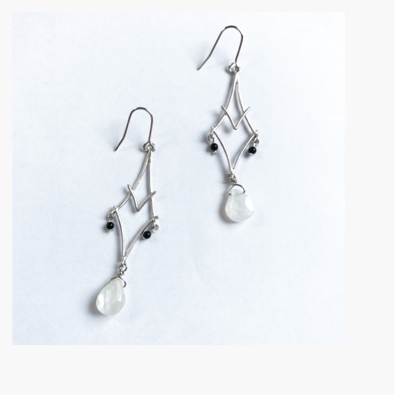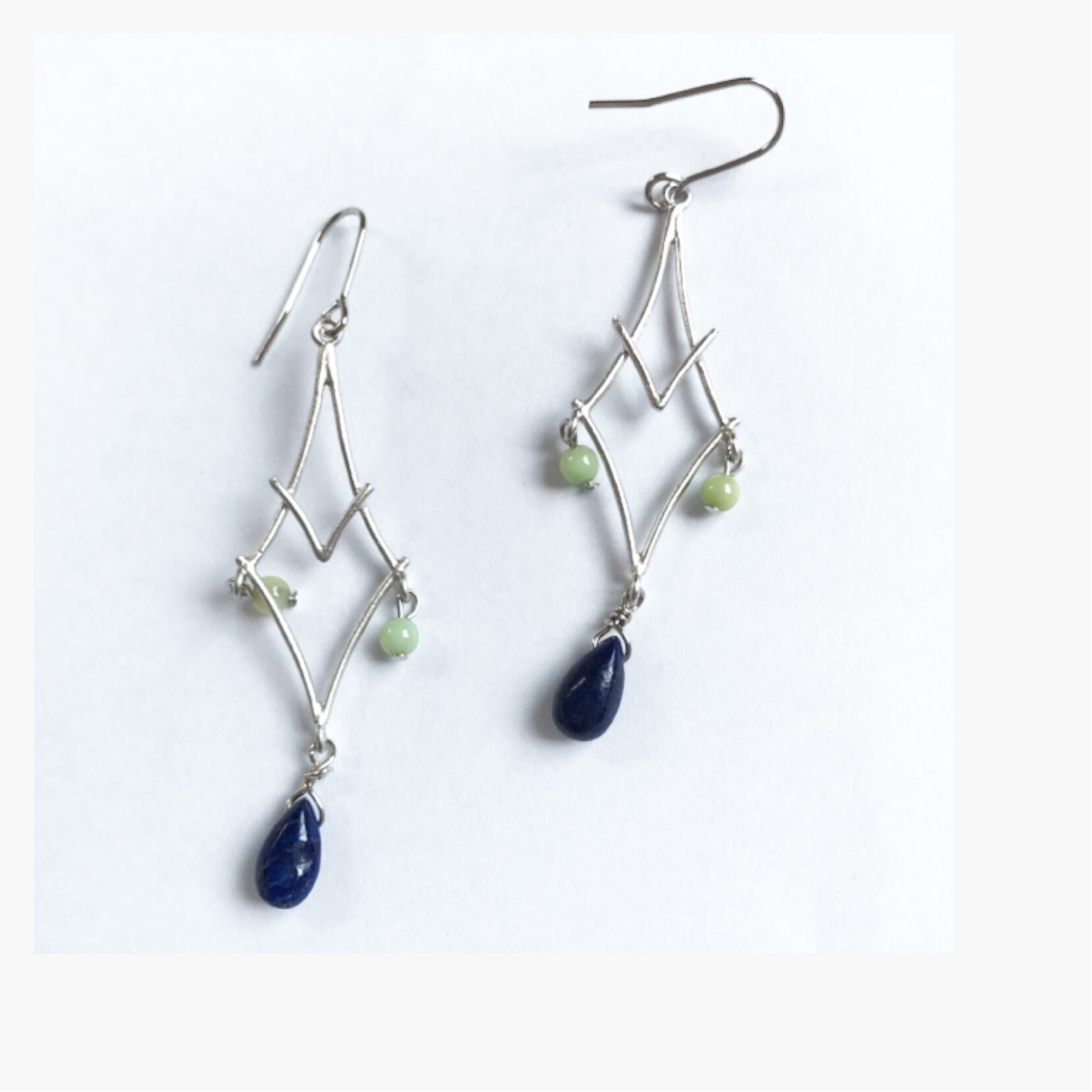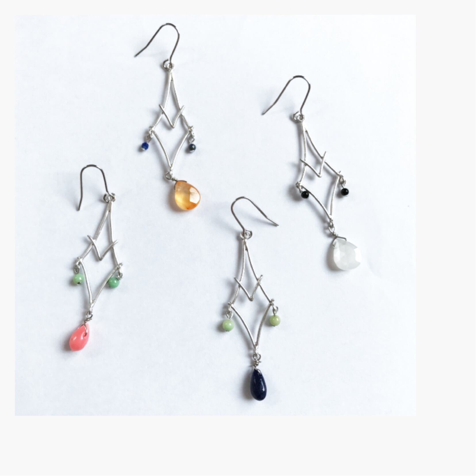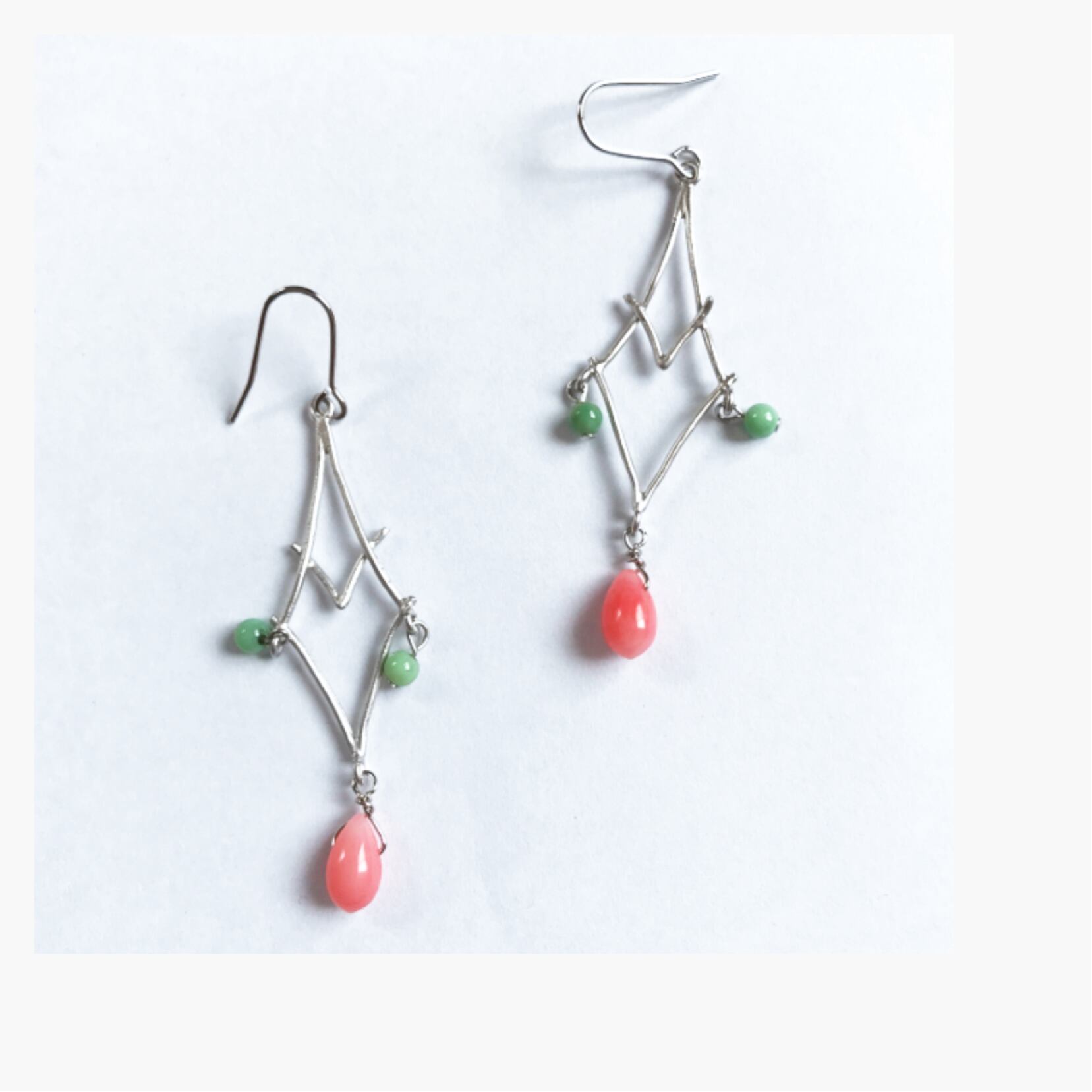 インポートの変わったトライアングルパーツに天然石を合わせたピアス、イヤリングです。