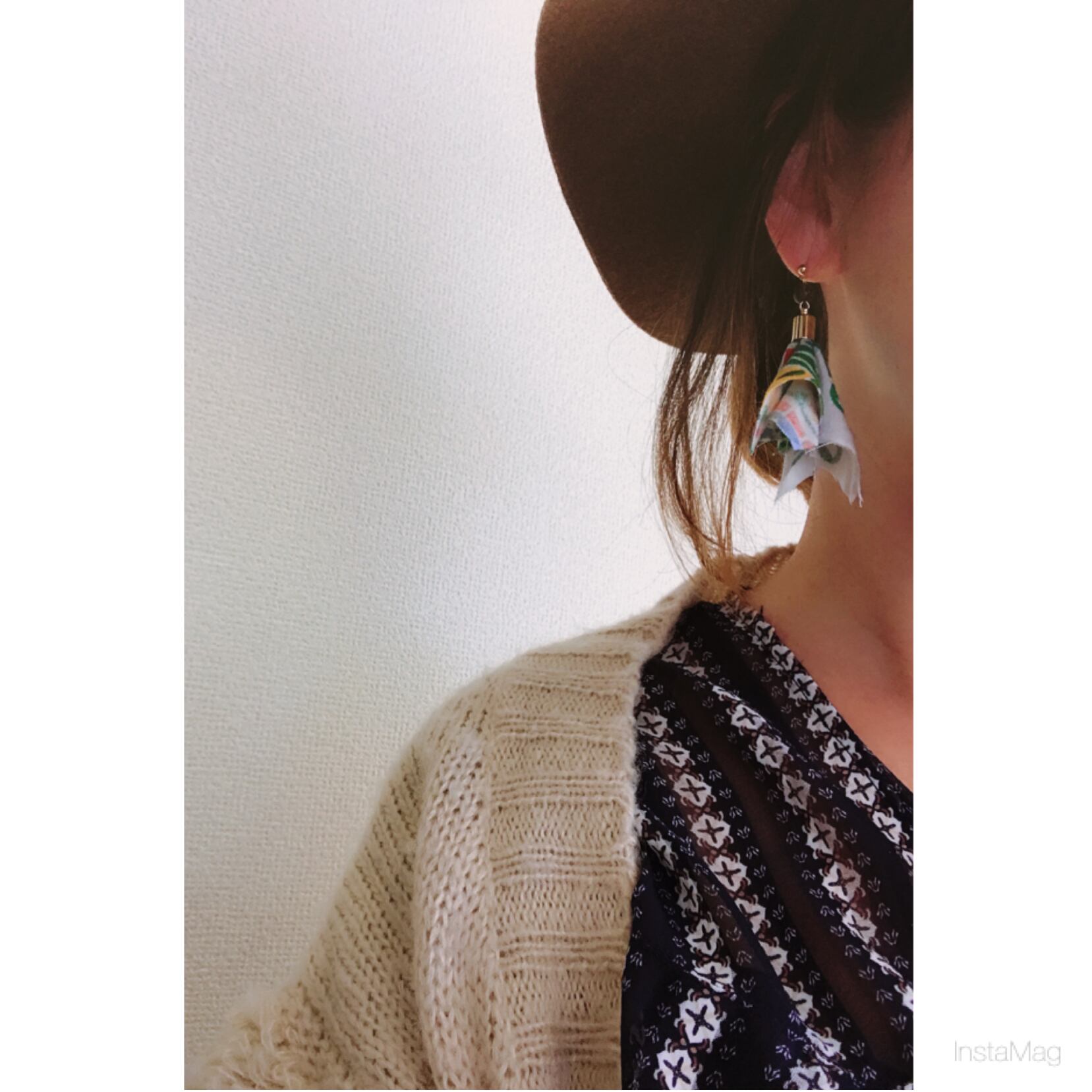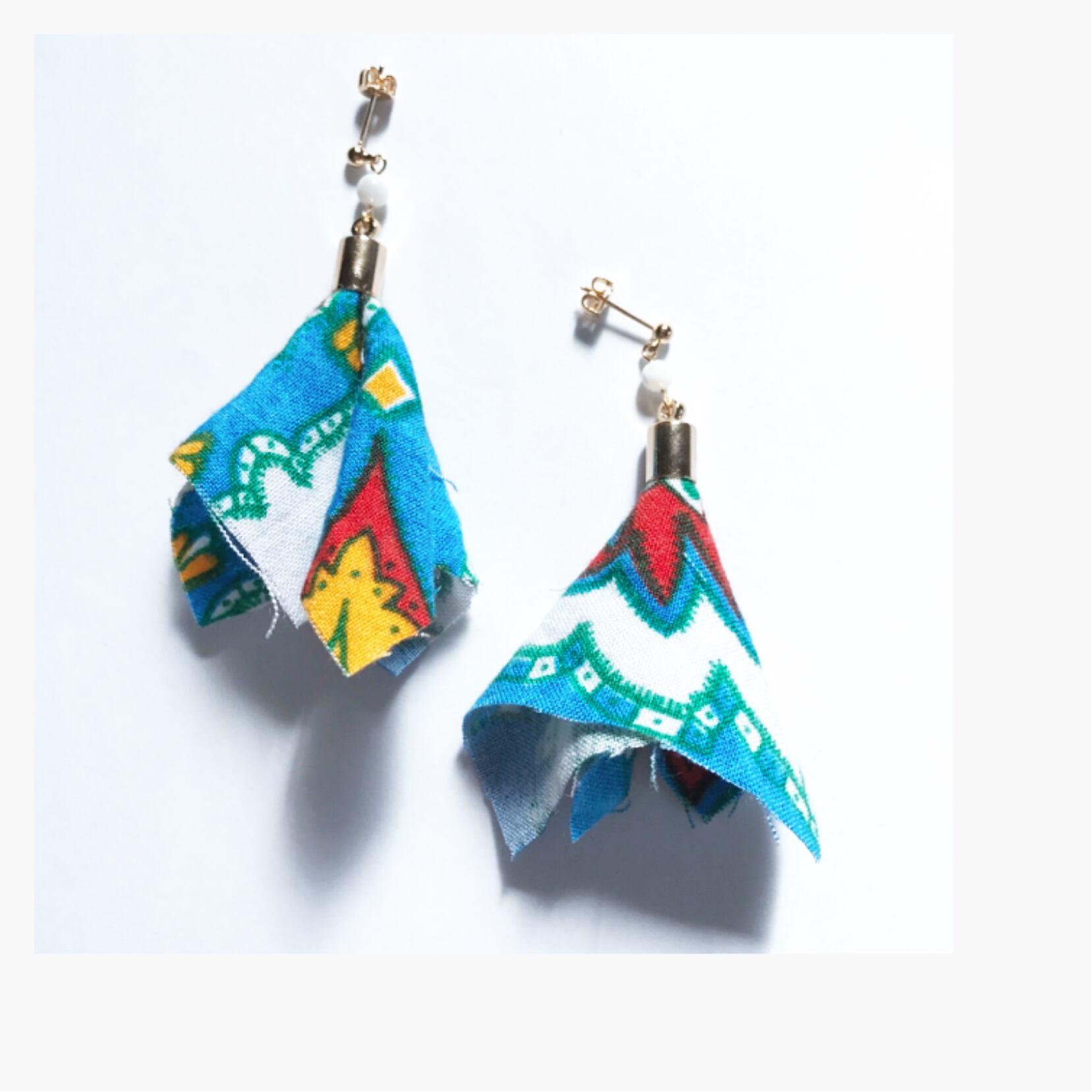 選りすぐったヴィンテージのスカーフを切りっぱなしにして天然石を合わせた、存在感ある個性のあるピアス、イヤリングです。