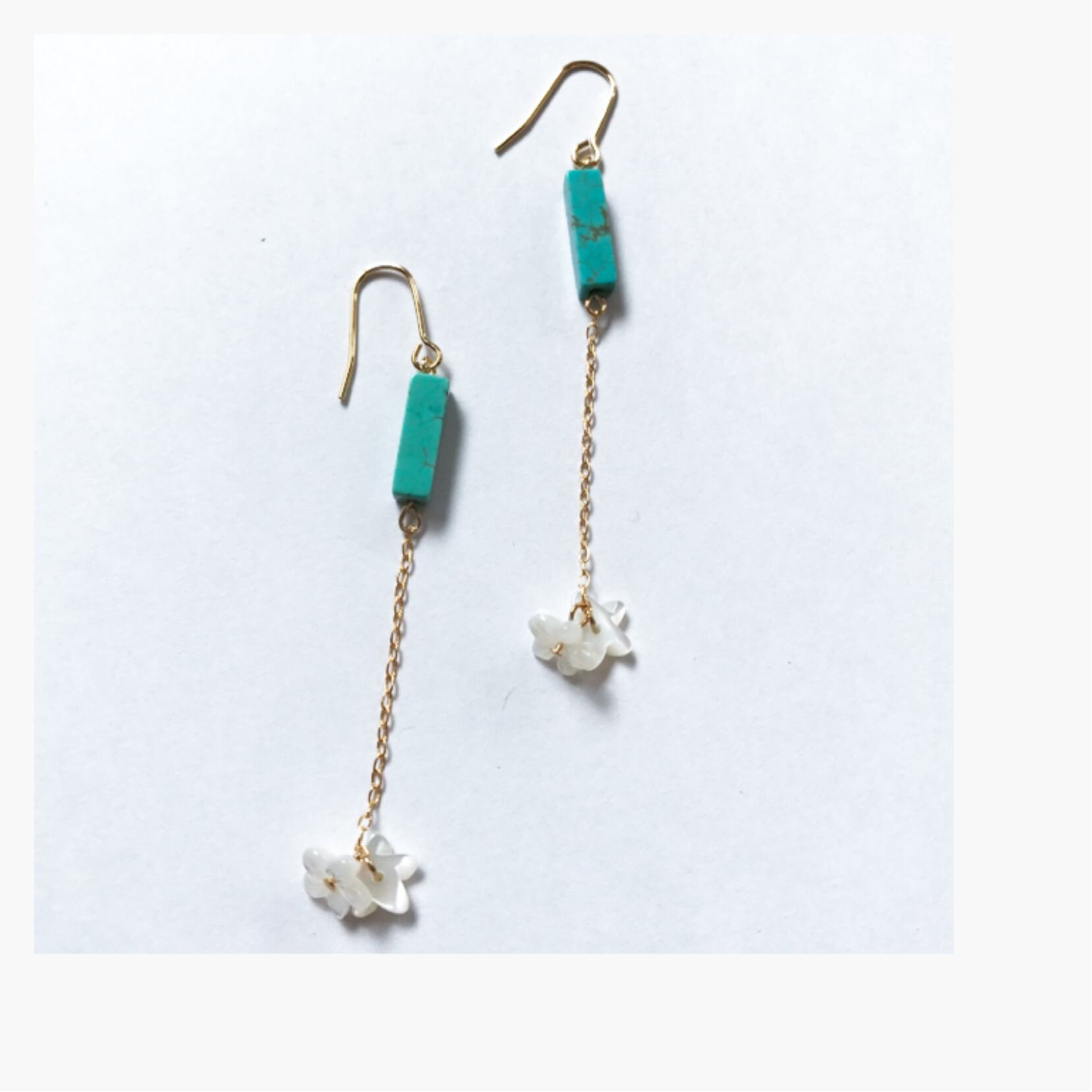 フラワーモチーフのシェルとターコイズのシンプルなデザインのピアス、イヤリングです。