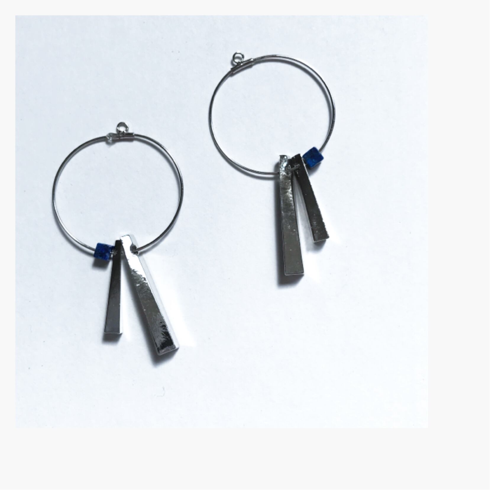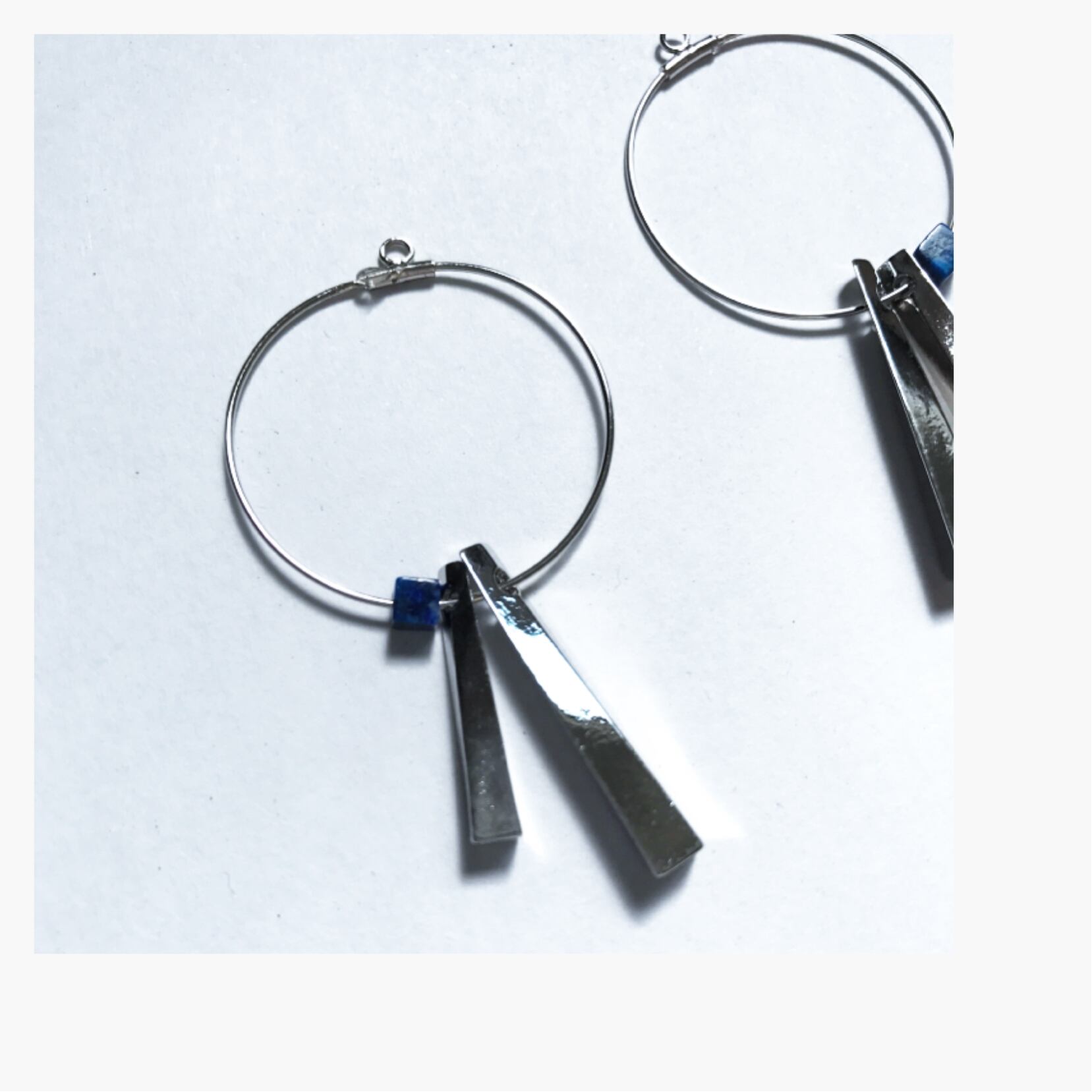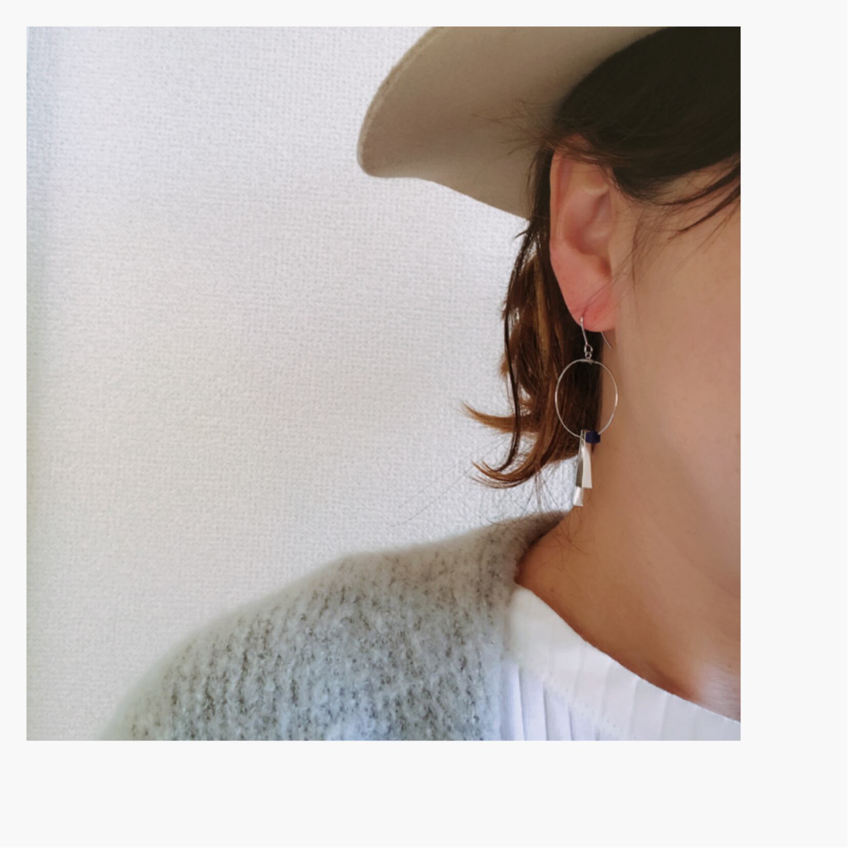 フープにスティックと小さなラピスラズリを合わせた、シンプルなピアス、イヤリングです。