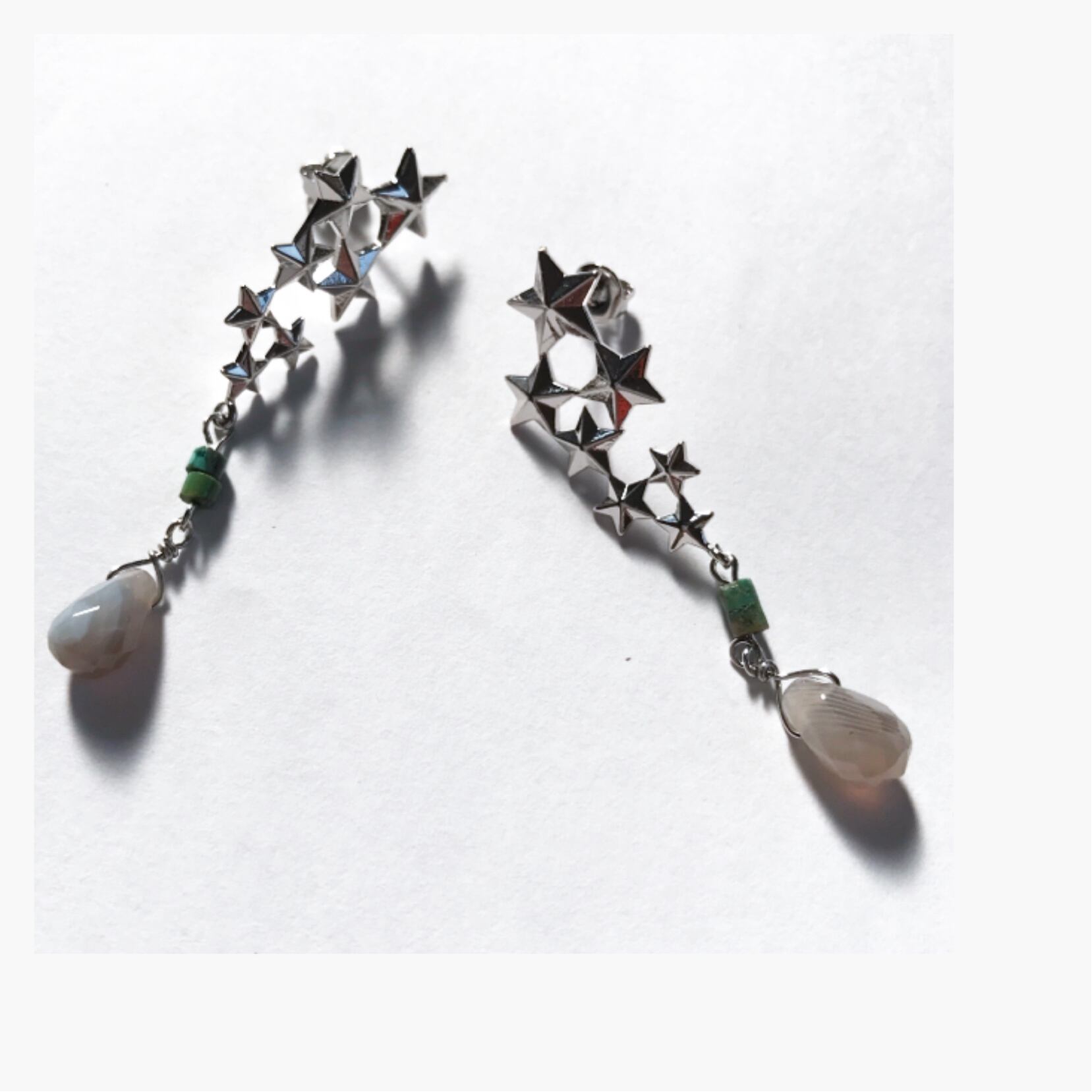 流れ星のような可愛いパーツにグレー×ターコイズで大人ぽい色の組み合わせのピアスです。