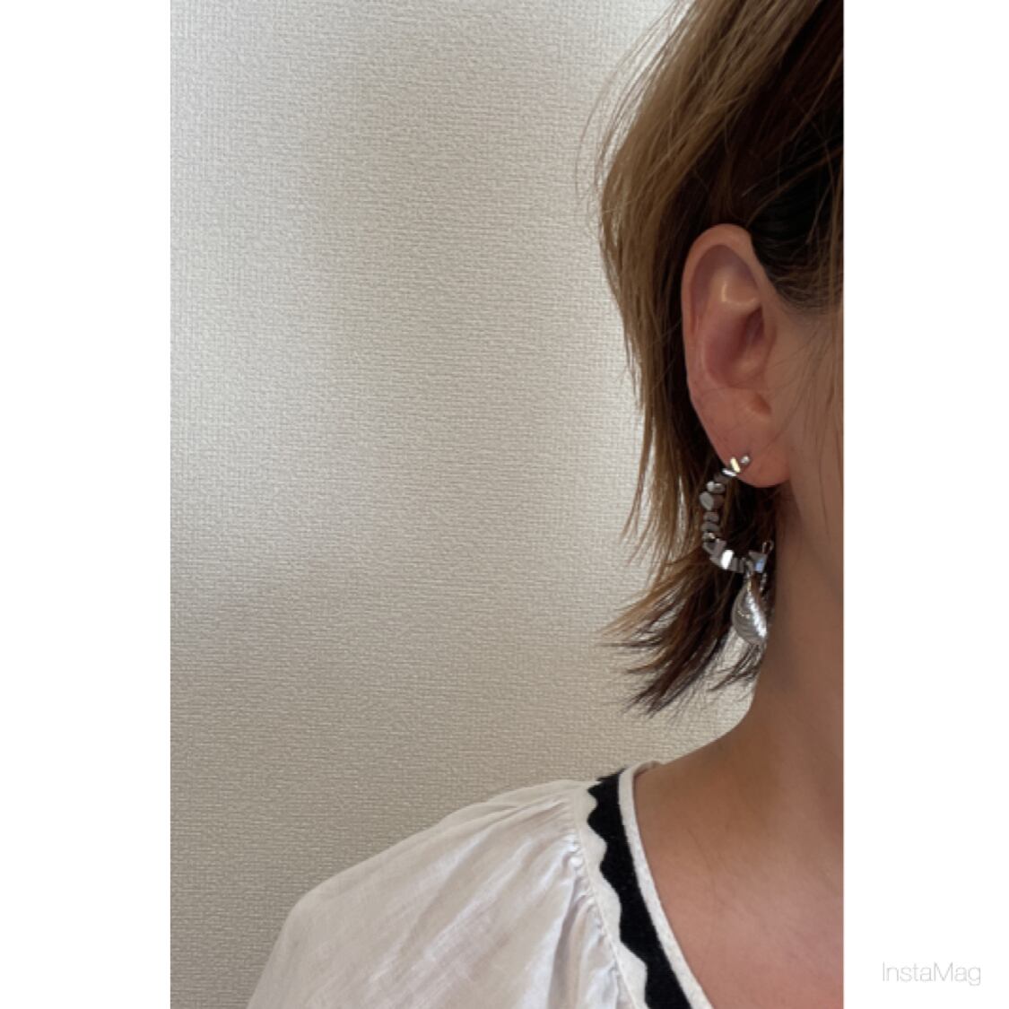 歪なカットが面白いシルバービーズとシェルパーツを合わせた半フープピアスです。