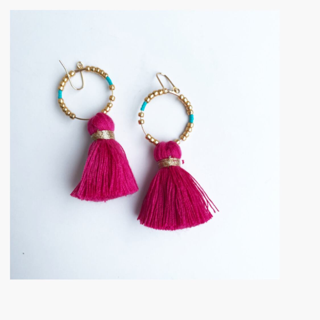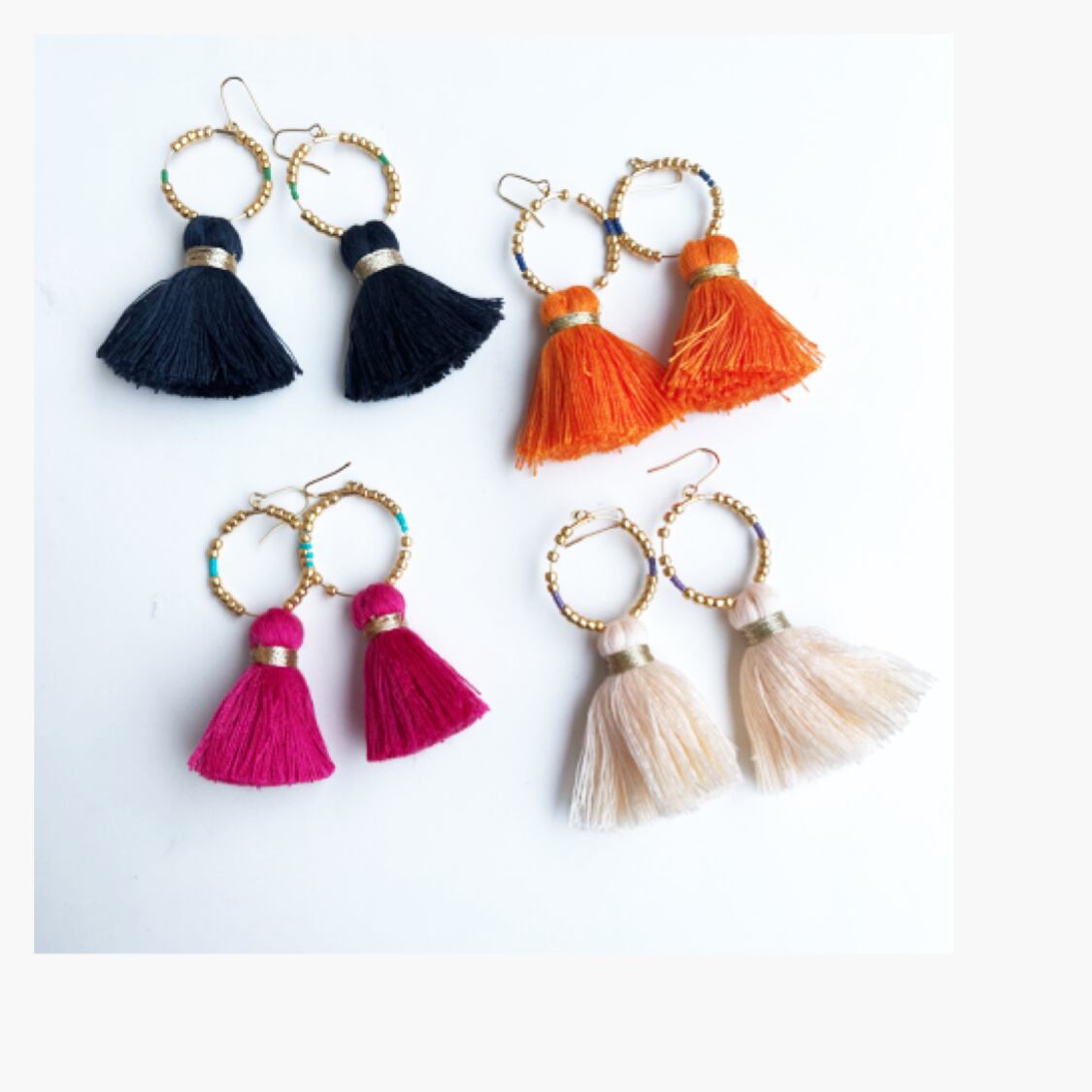大振りなタッセルをメインに、それぞれカラーを変えたビーズを合わせたピアス、イヤリングです。