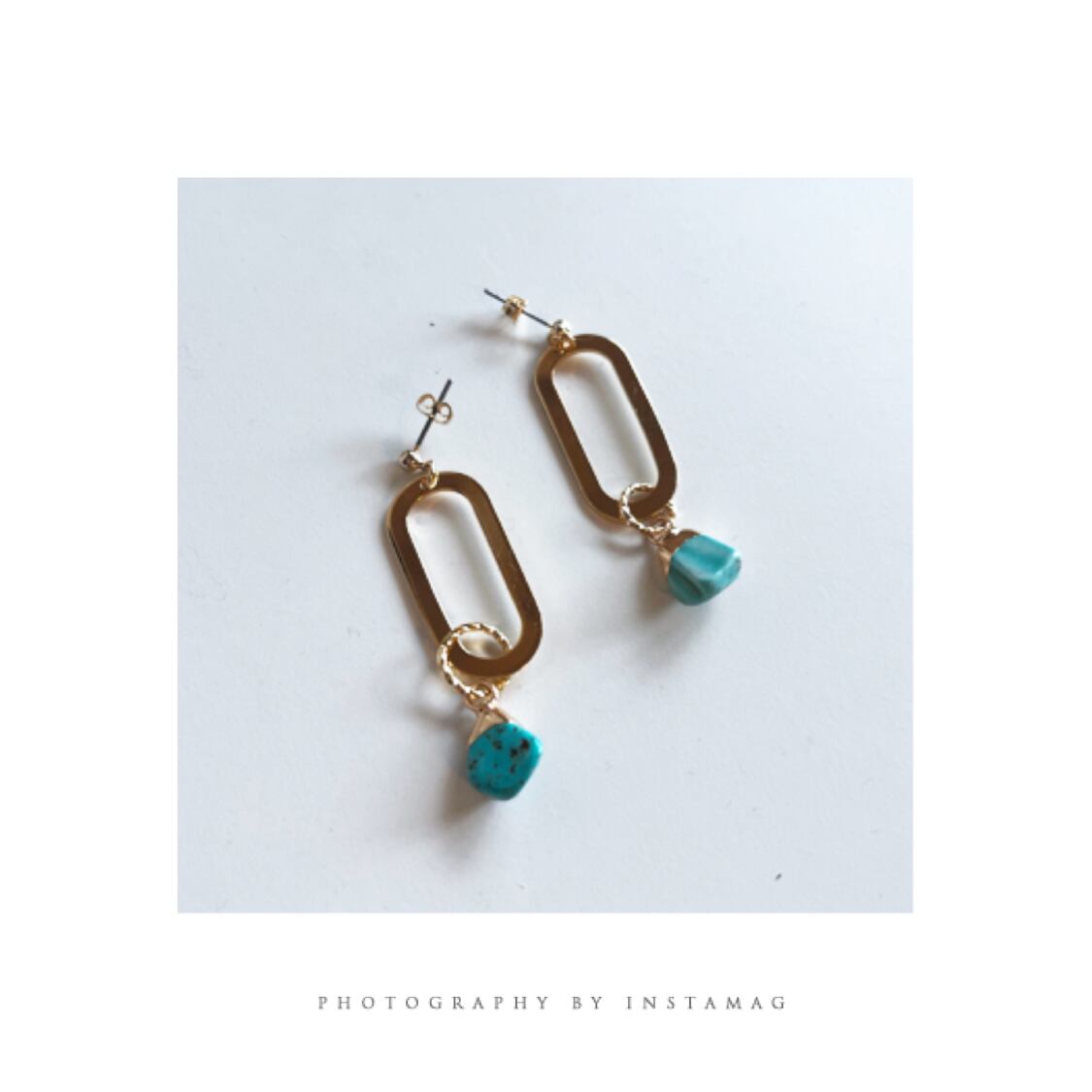 コロンとしたサイズ感も色味も可愛いターコイズをメインに、焼けた肌に似合うゴールドと合わせたピアス、イヤリング。