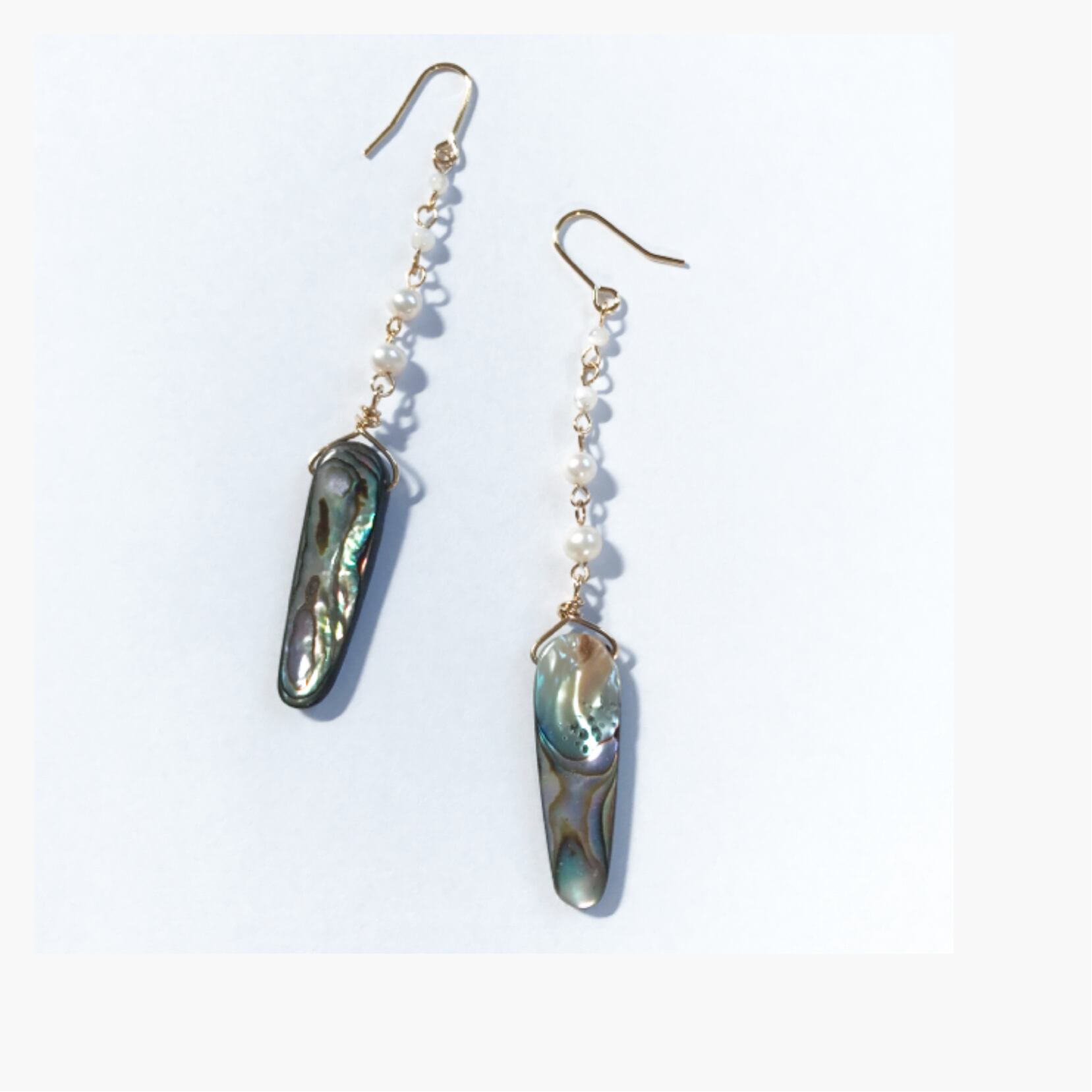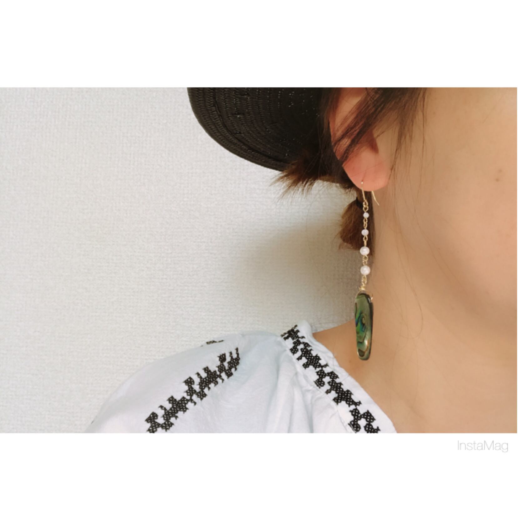 独特の色味を出すアバロンシェルをメインにマザーオパールと淡水パールで女性らしさを出したピアス、イヤリングです。