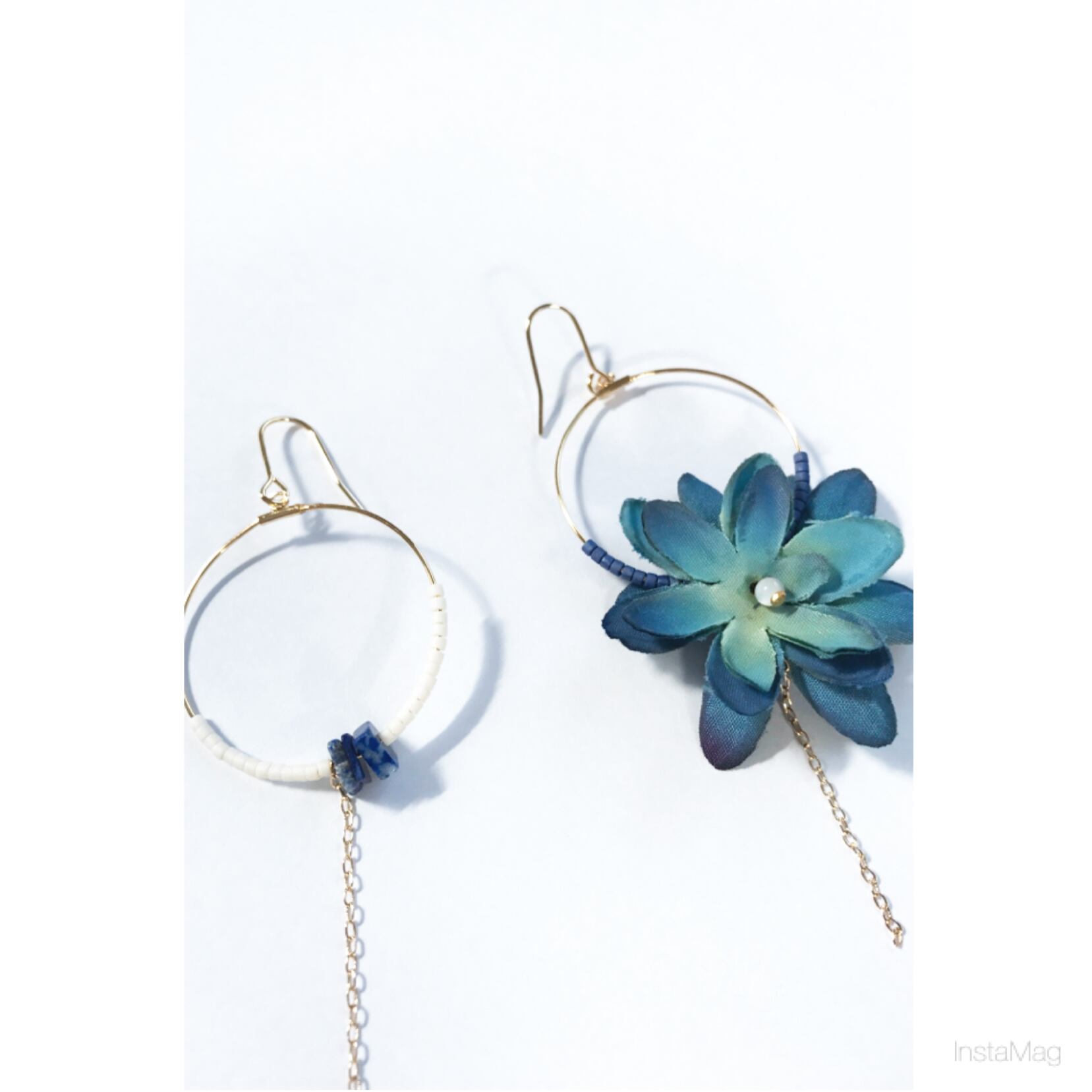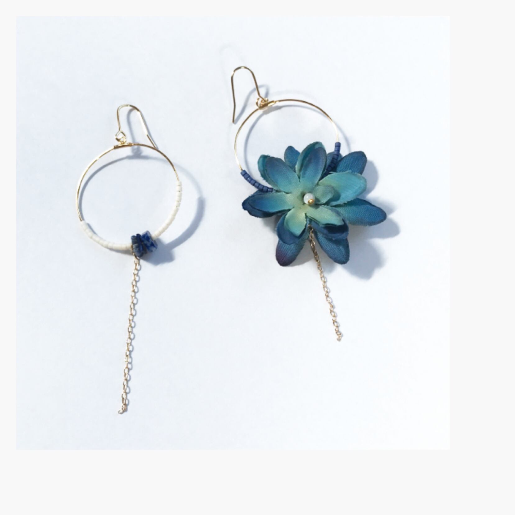 ネイビーよりのブルーのお花なラピスラズリを組み合わせた左右デザインの違うアシメントリーなピアス、イヤリングです。
