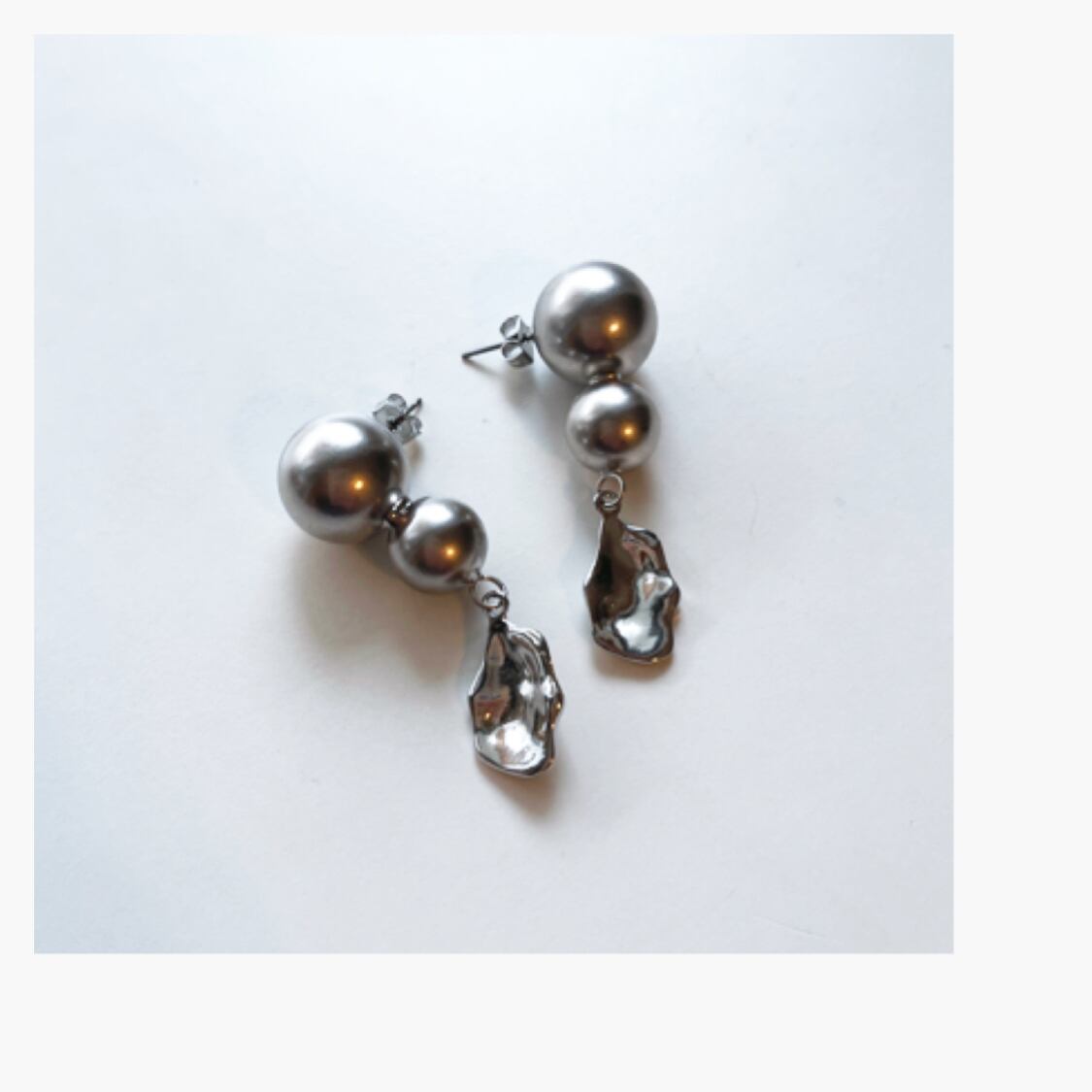大きさの異なるシルバーボールピアスに歪なシルバーパーツを合わせたデザイン!