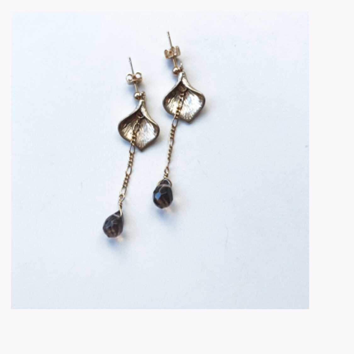 葉モチーフにカットの綺麗なスモーキークォーツが揺れるデザインのピアス、イヤリングです。