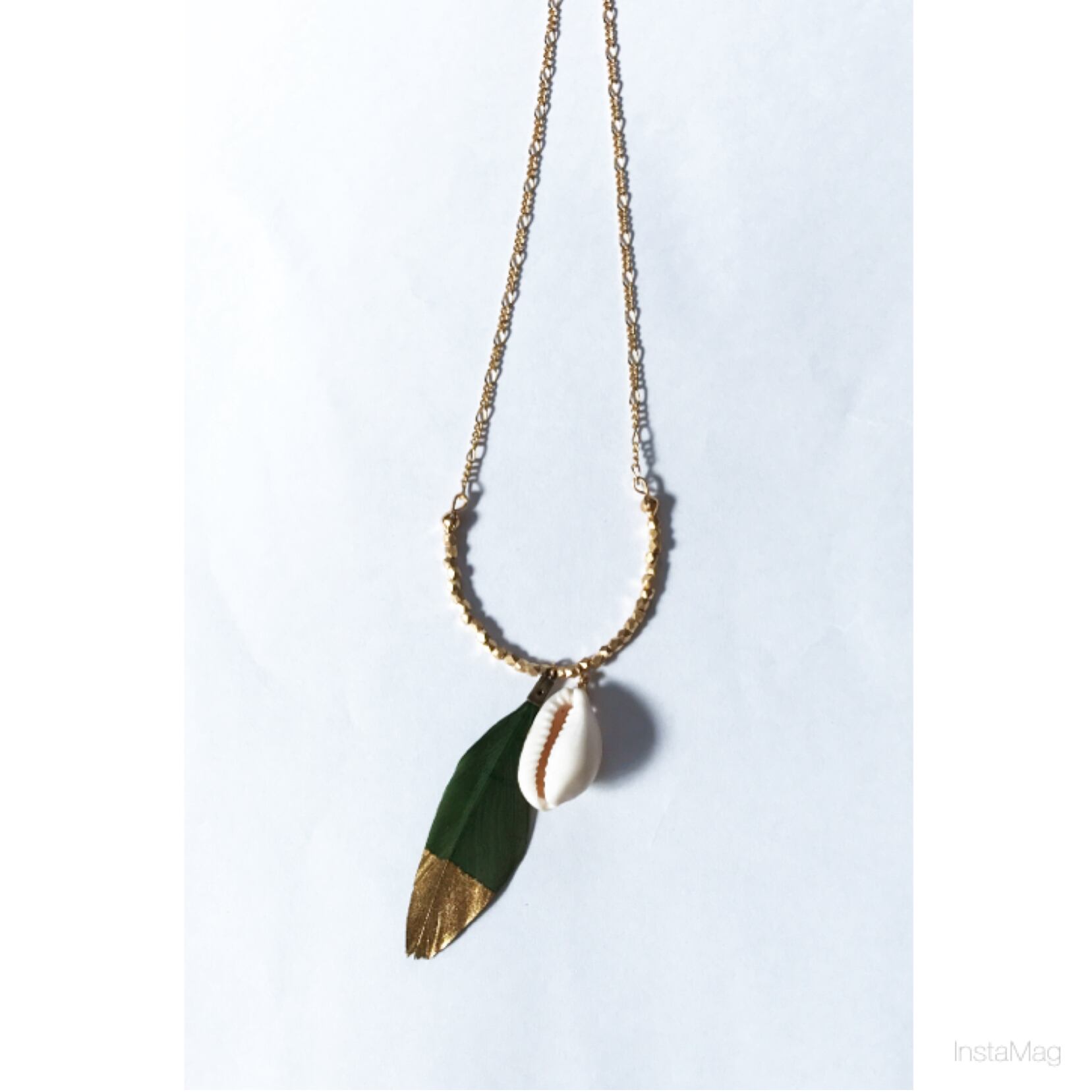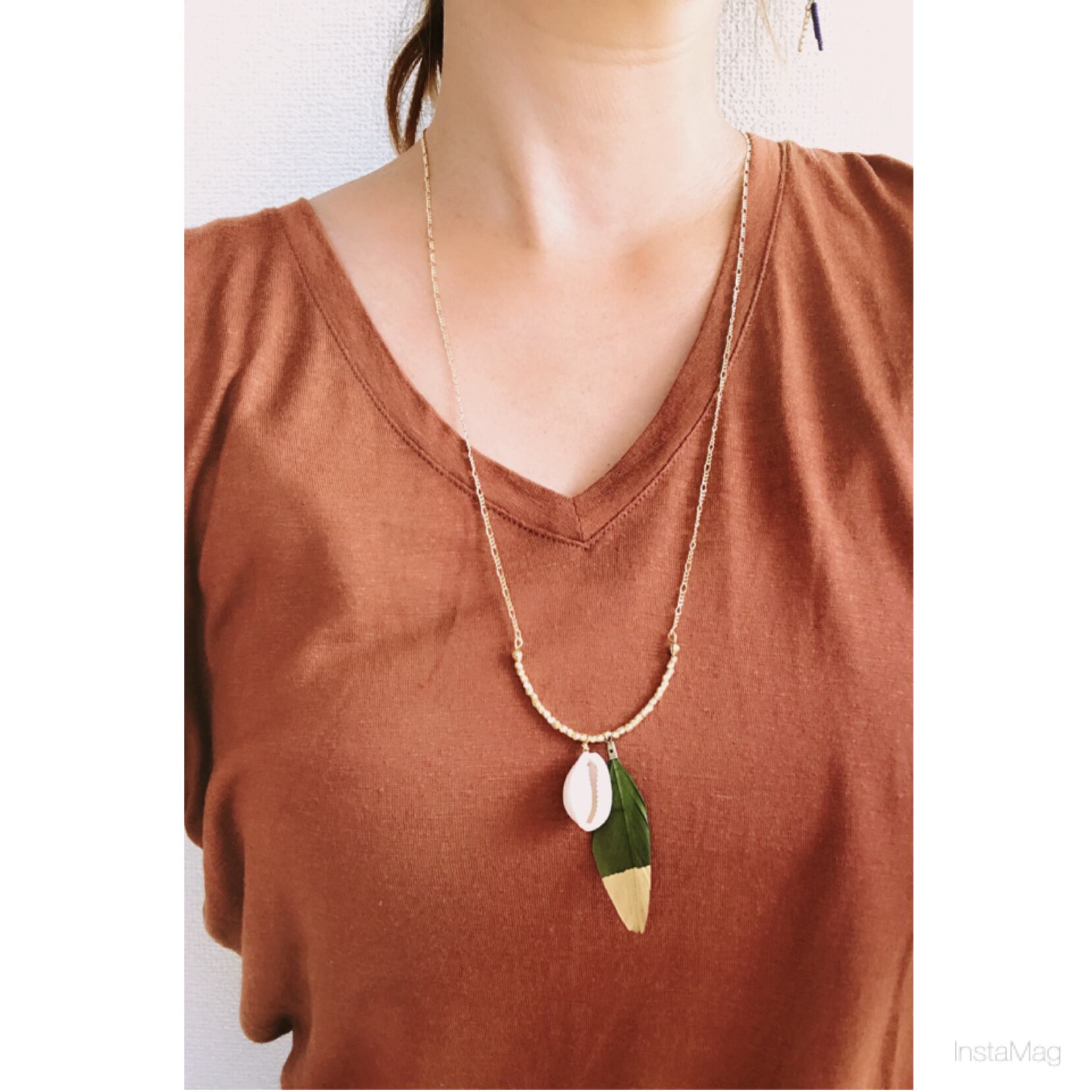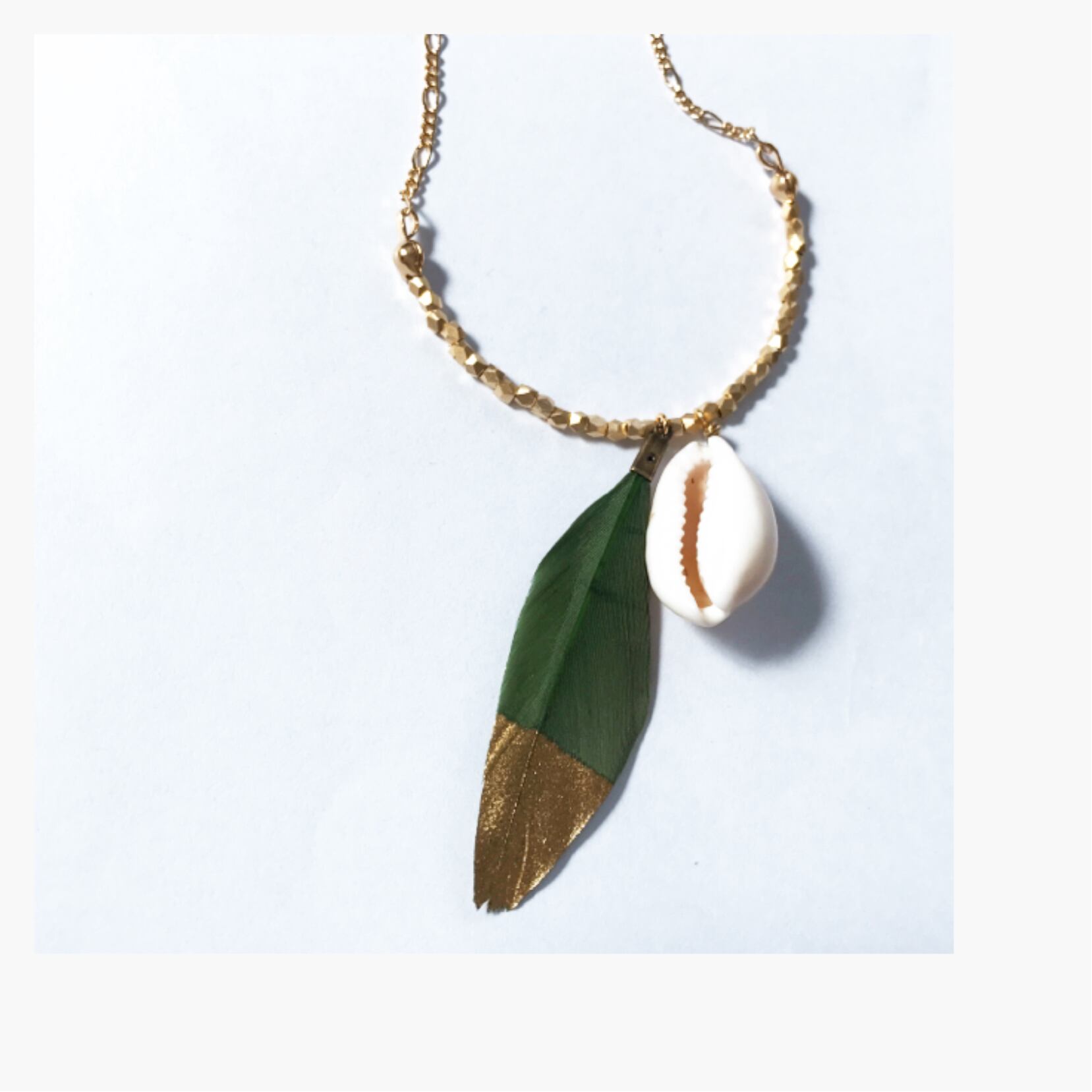 カーキにゴールドの大人ぽい羽と貝を組み合わせたシンプルなロングネックレスです。