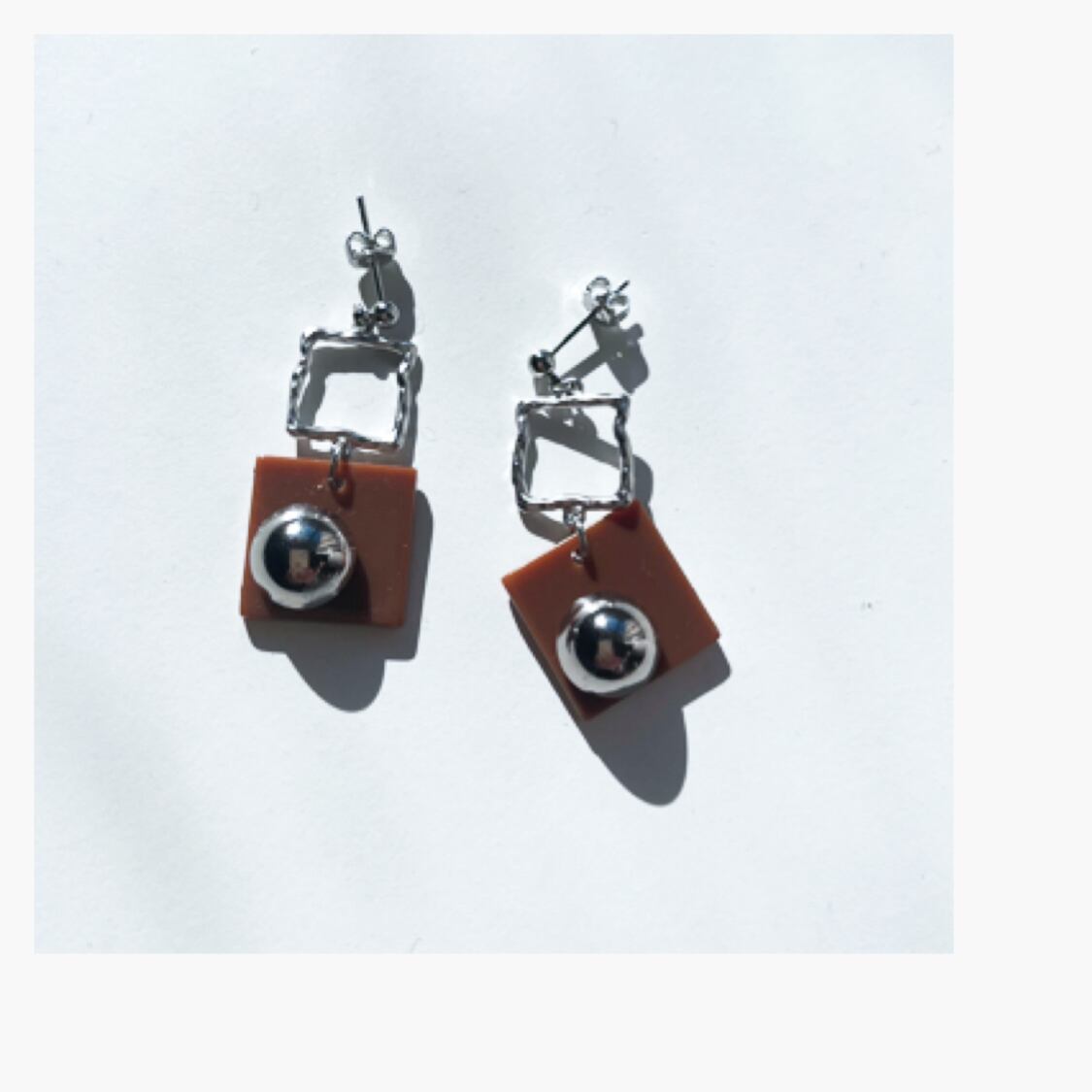 ブラウンカラーのスクエアにシルバーを合わせたピアス、イヤリング。