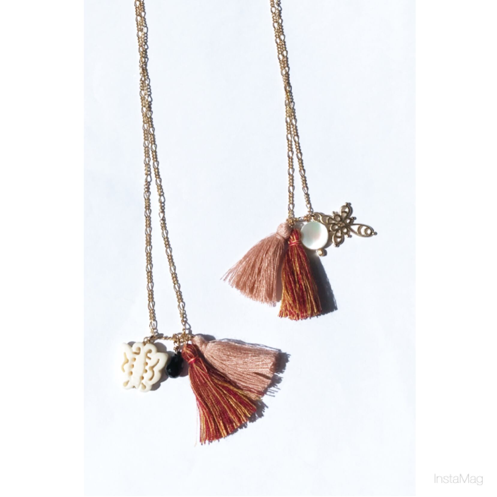 ナチュラルな色のタッセルとシェルモチーフのシェル。