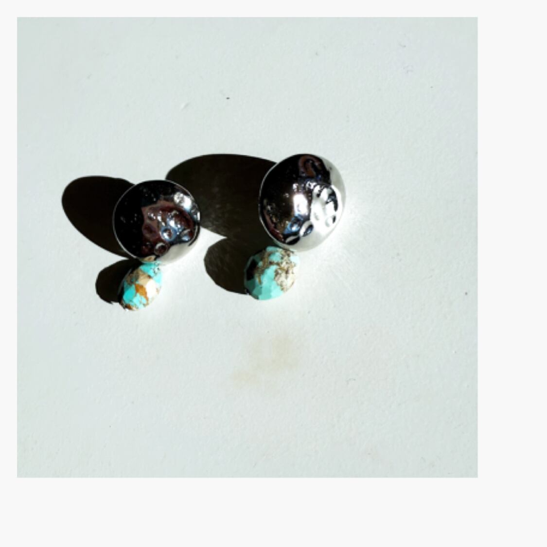 打ちっぱなしのシルバーピアスが既に可愛いけれど、そこに色の綺麗なターコイズを合わせました。 ✴︎サイズ 長さ約3㎝ ✴︎素材 ターコイズ、メッキ、ステンレスポスト