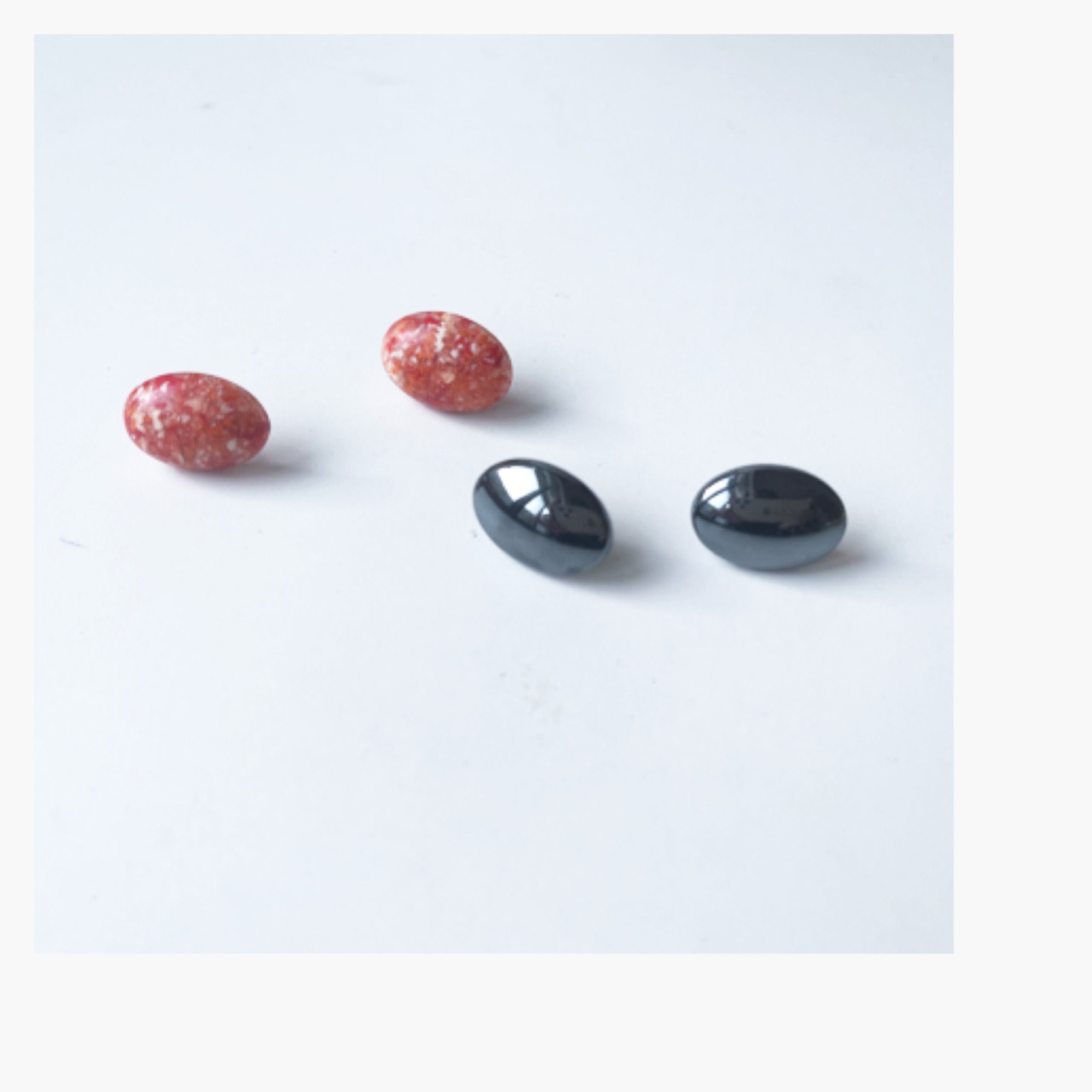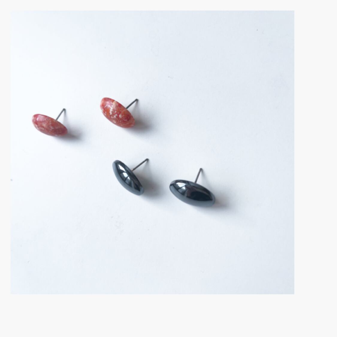ブラックミラーのヘマタイトと、オレンジ系のヴィンテージカボション、カーキとオレンジのマーブル系のピアス、3種類のタイプがございます!