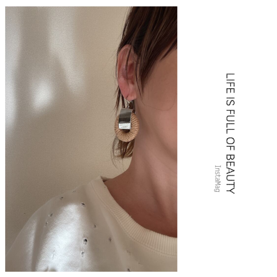 太めのラタンリングにシルバーパーツを合わせたピアス、イヤリング。