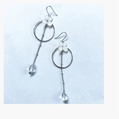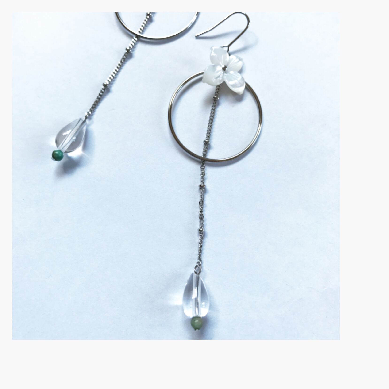 お花モチーフのシェルにクリスタルとターコイズをユラユラさせたフープピアス、イヤリングです。