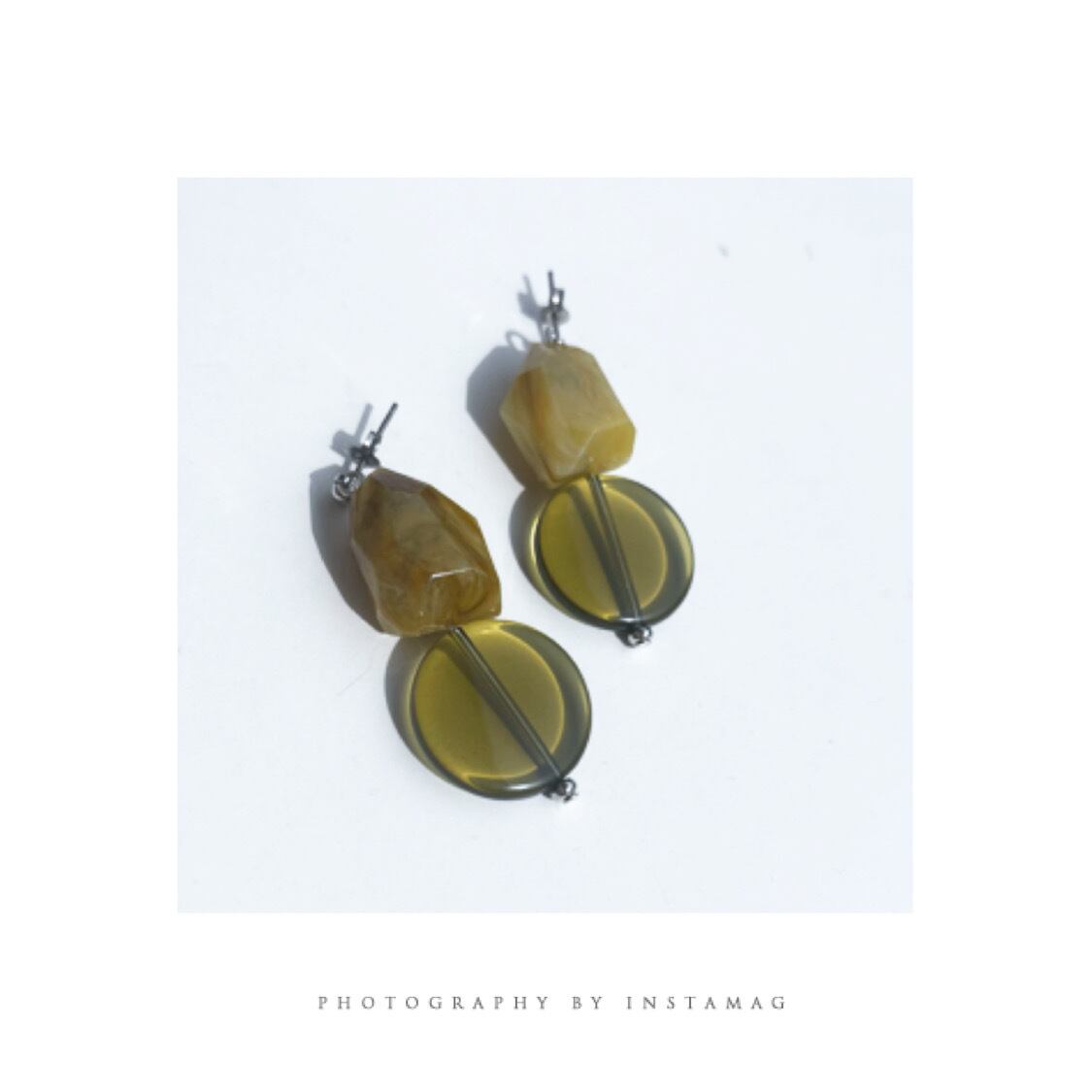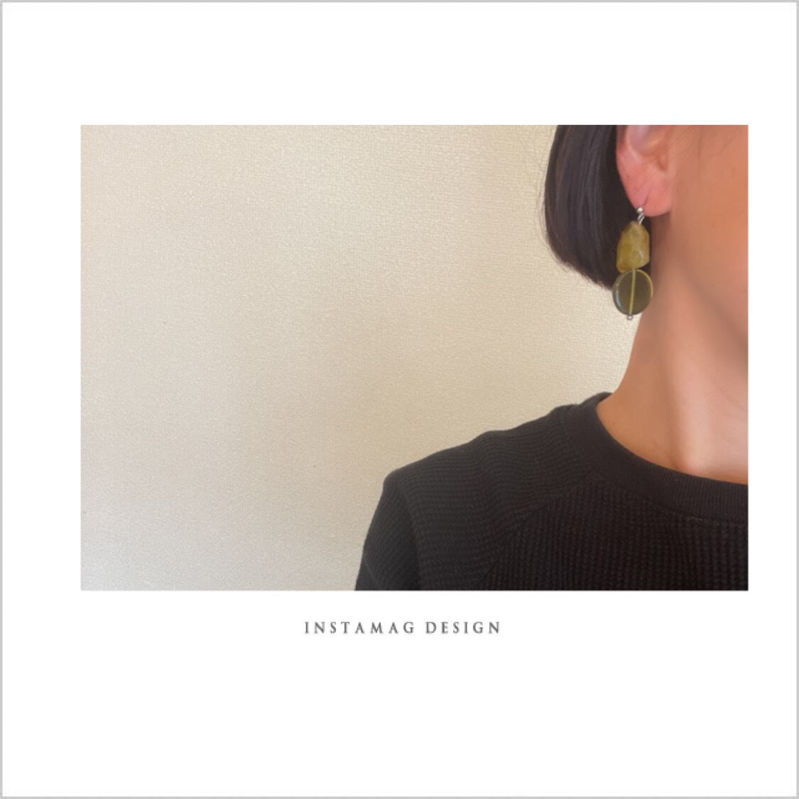 マーブルのカットの綺麗なビーズとクリアグリーンを合わせたピアス、イヤリングです!