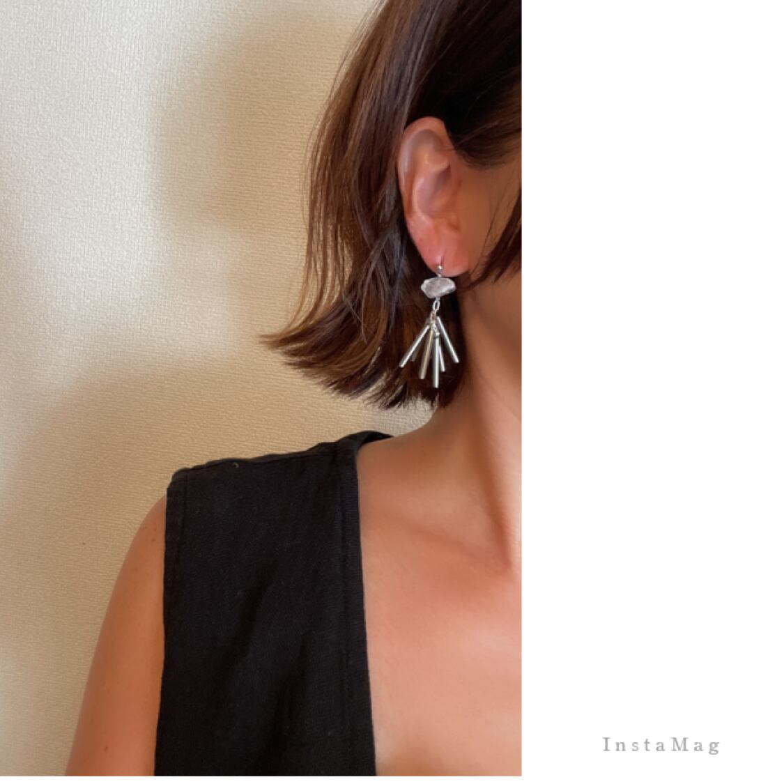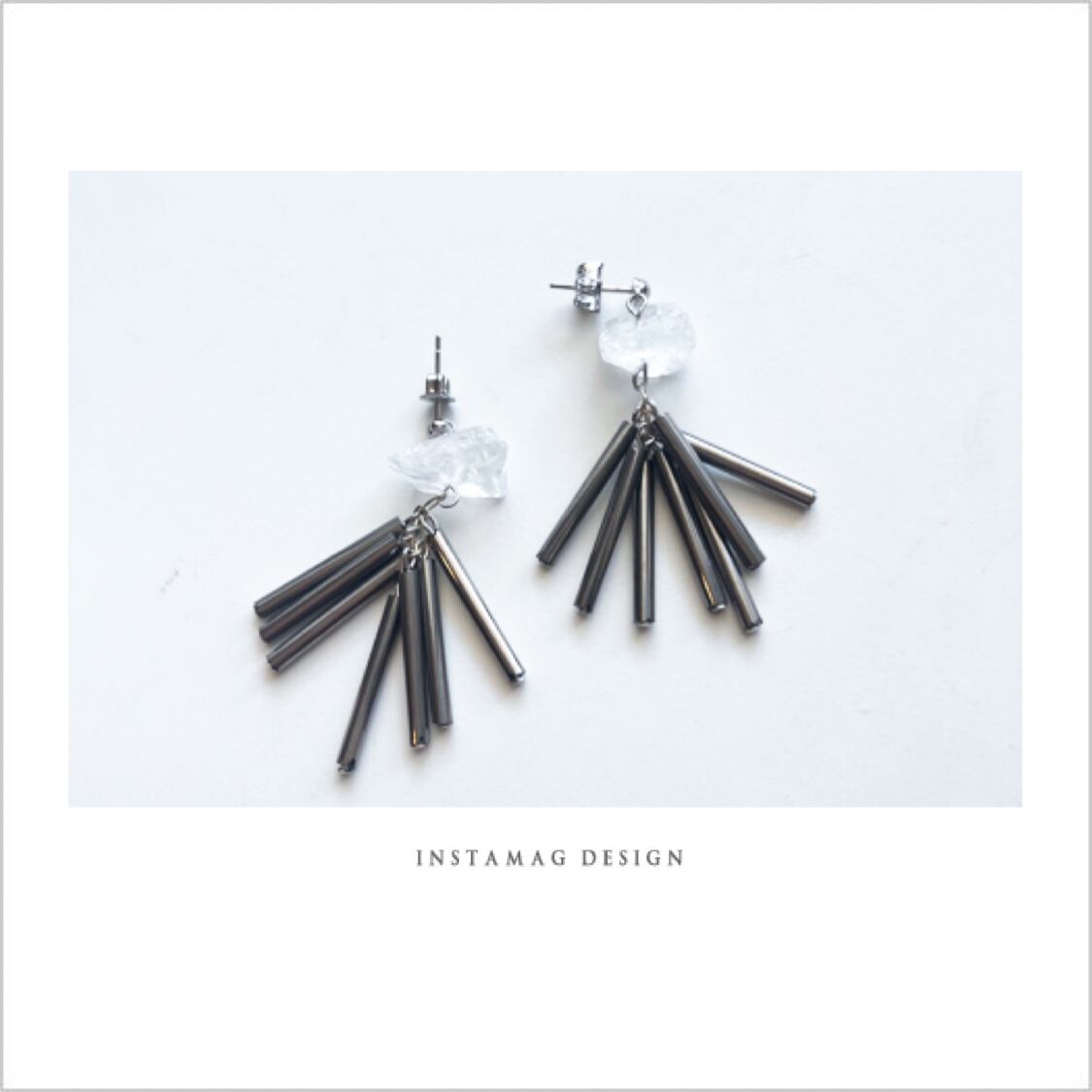 シルバーとゴールドのパイプビーズでフリンジに作りクリスタルと合わせたピアス、イヤリングです。