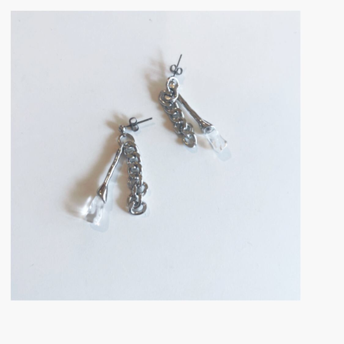 クリアなドロップパーツと太めのチェーンを合わせたピアス、イヤリングです。