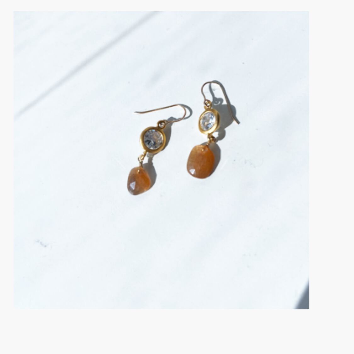 カットと、色味が綺麗なサンストーンとキラキラなガラスパーツを合わせた品あるピアス、イヤリング。