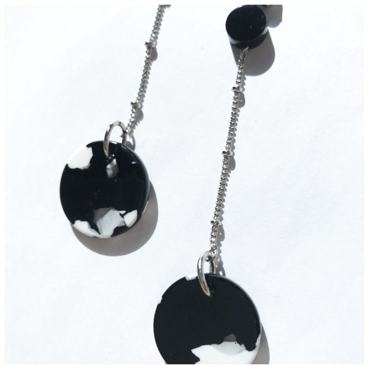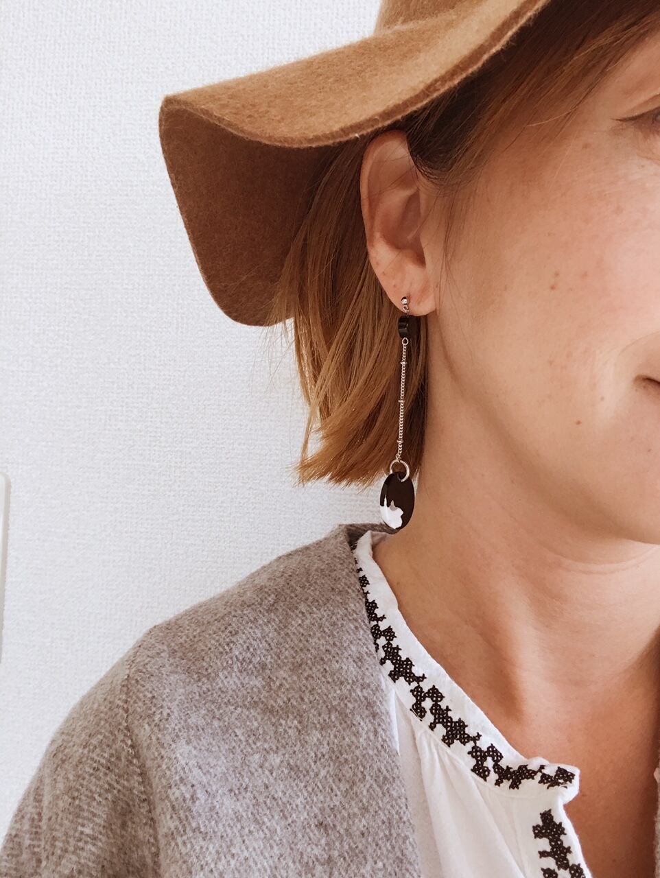 アセチルセルロース樹脂素材の黒白のモノトーンなパーツにオニキスを合わせたピアス、イヤリングです。