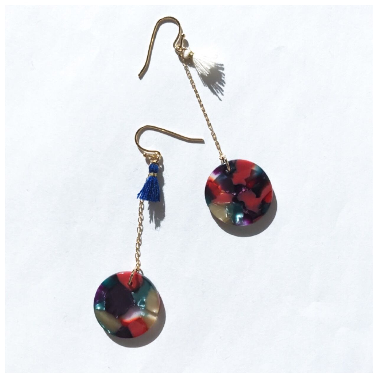直径2㎝のアセチルセルロース樹脂素材でできたカラフルなパーツをメインにタッセルを合わせたアシメントリーデザインのピアス、イヤリングです。