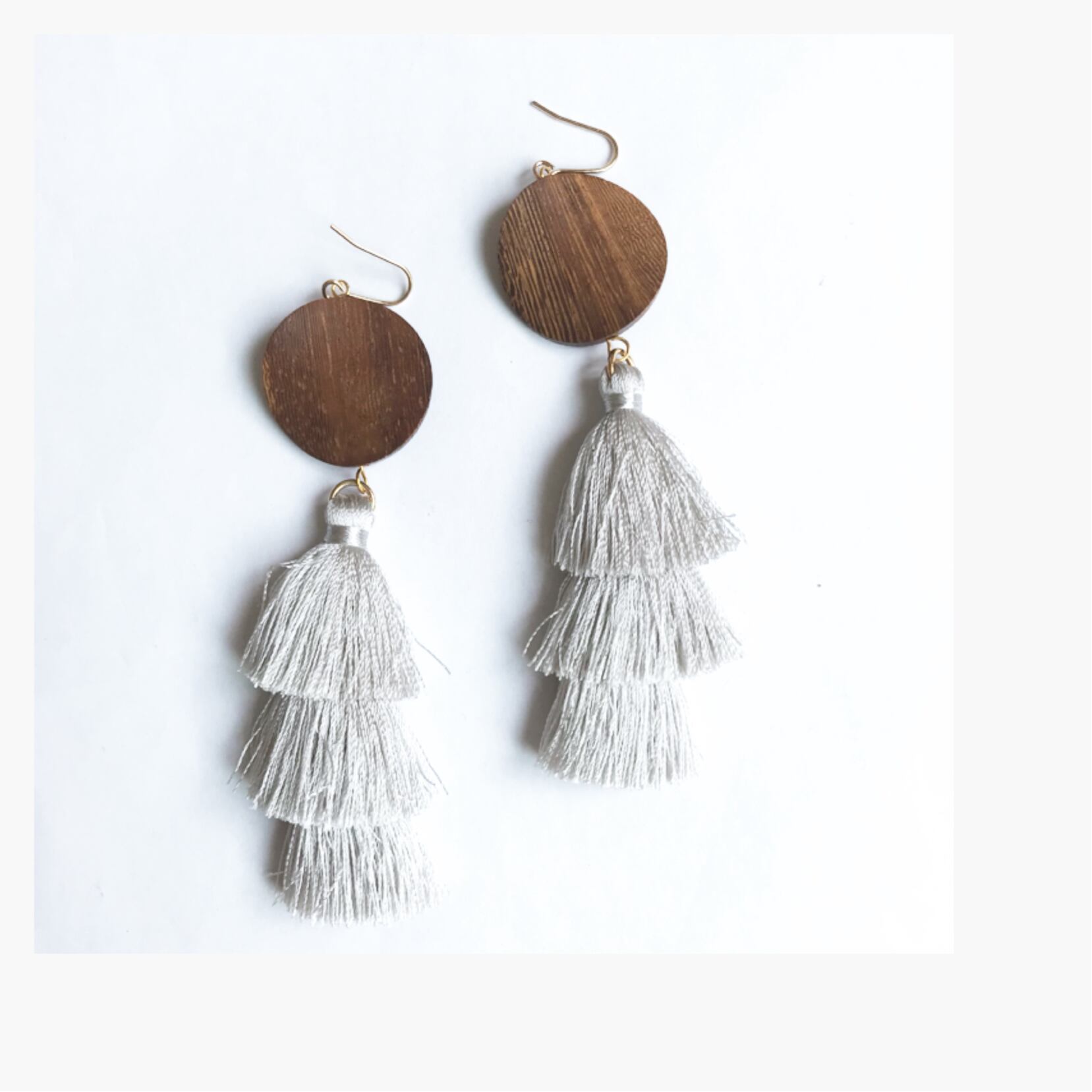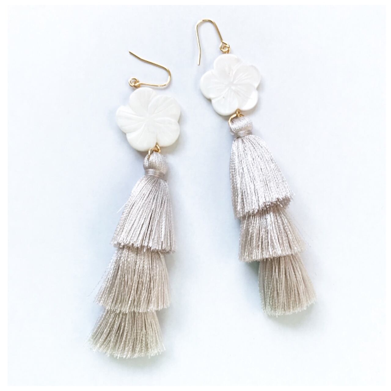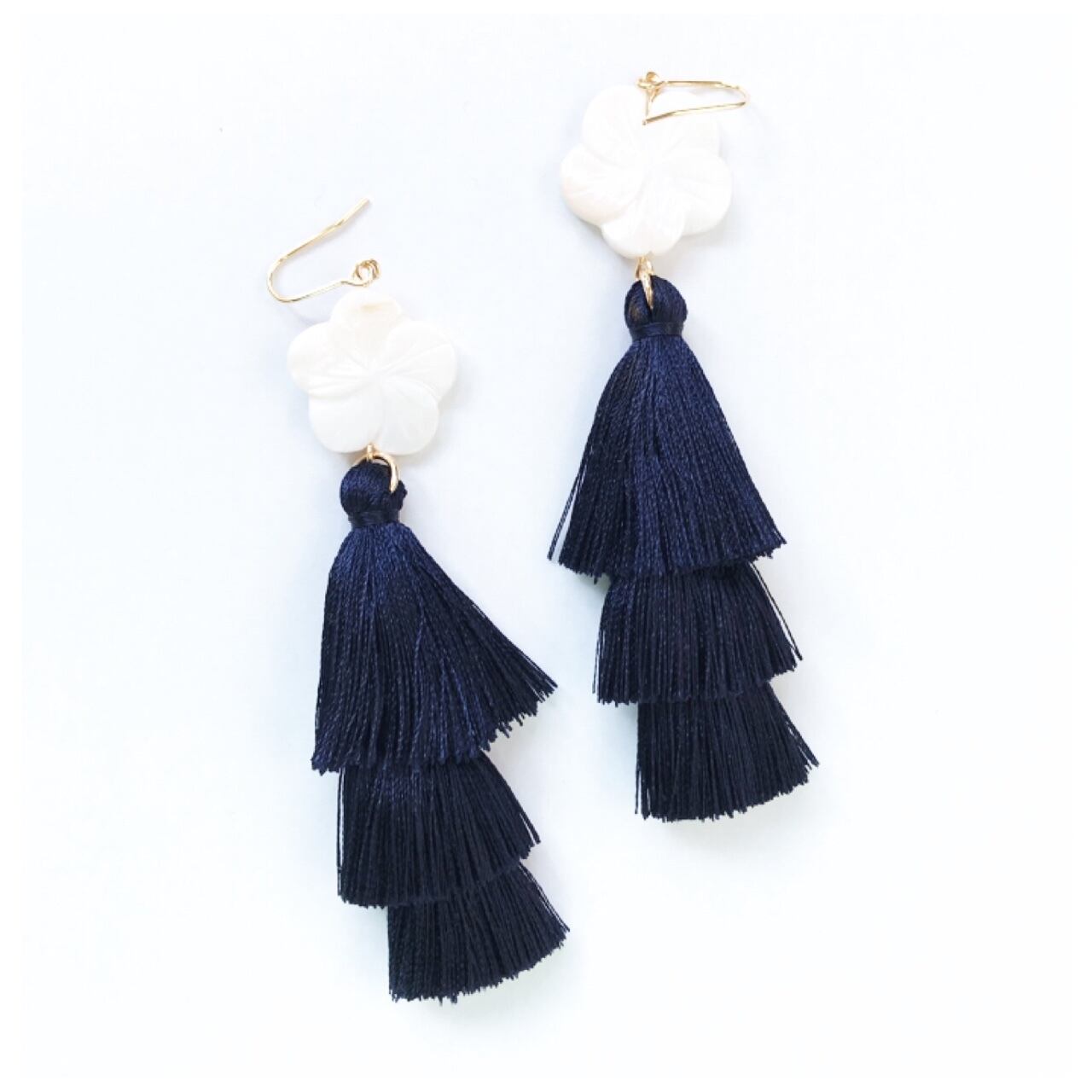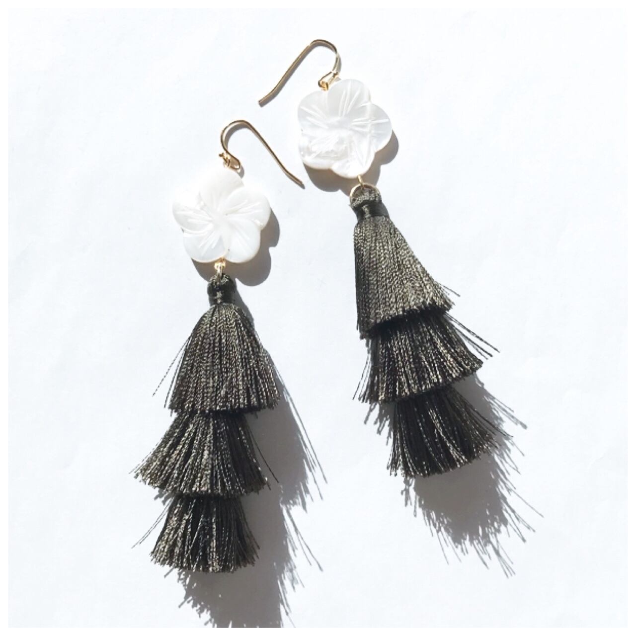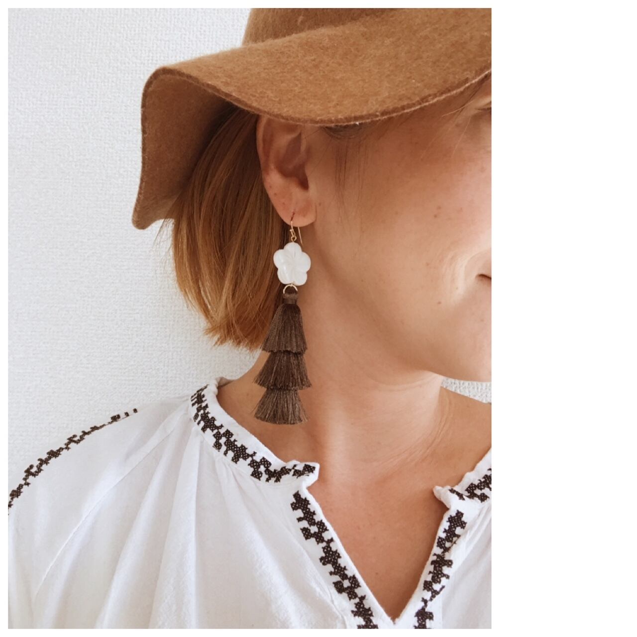 3連のボリュームある大人色のタッセルにフラワーシェルかウッドを合わせたピアス、イヤリングです。