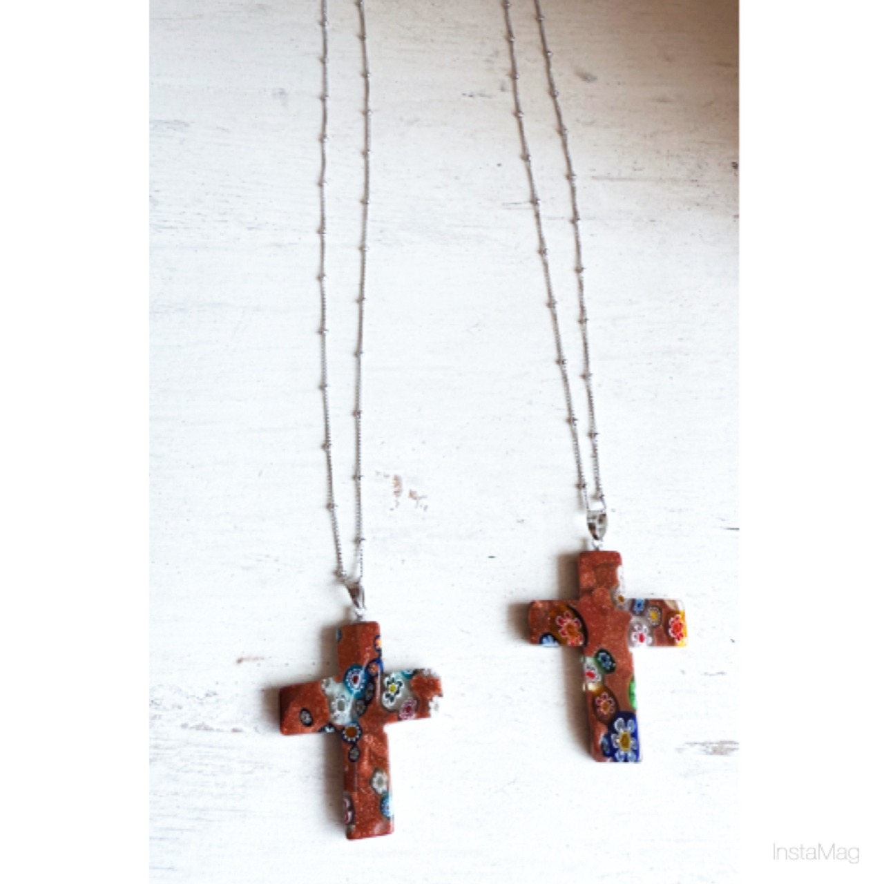 ミルフィオリのクロスネックレス。 花模様が可愛くて、存在感あるお品! ✴︎サイズ 長さ約49〜54㎝ ✴︎素材 ガラス、メッキ、ステンレス